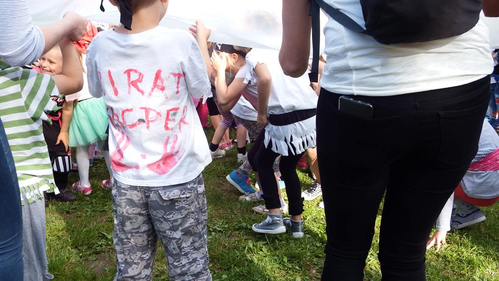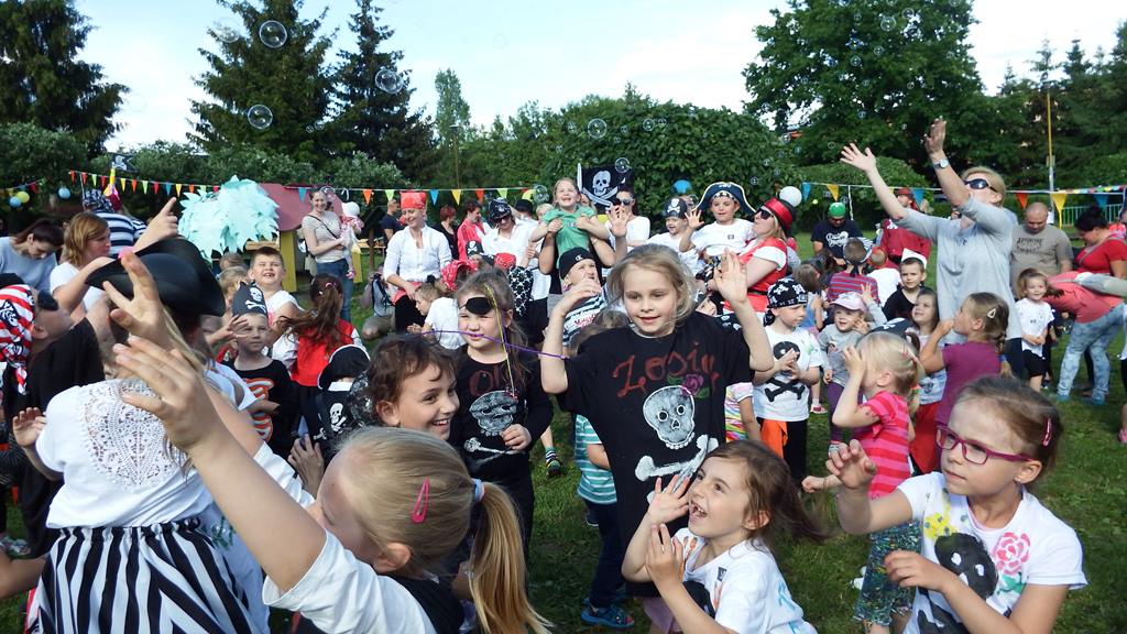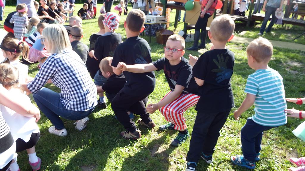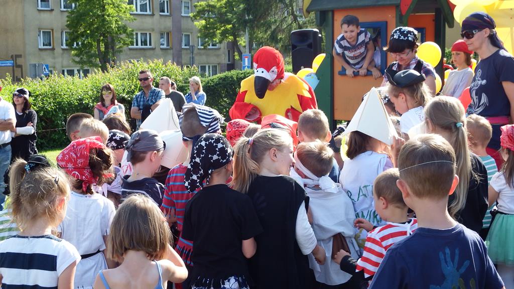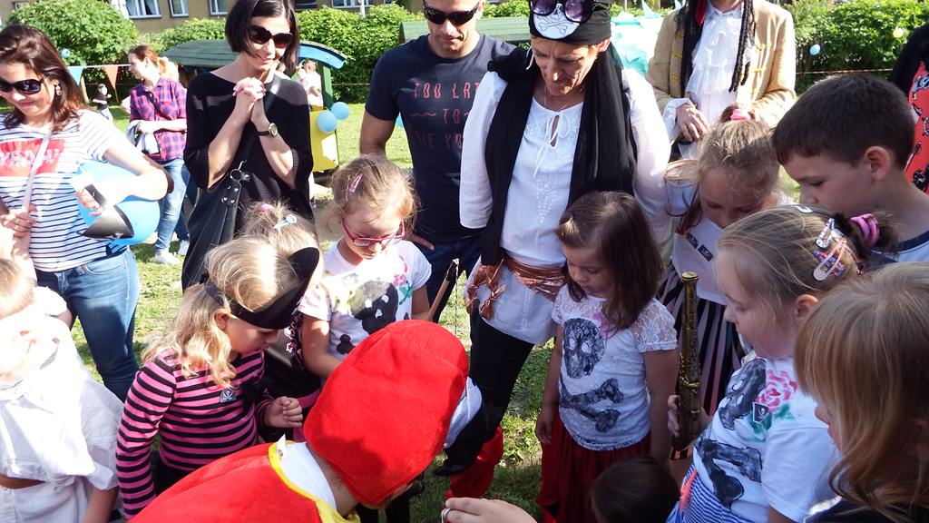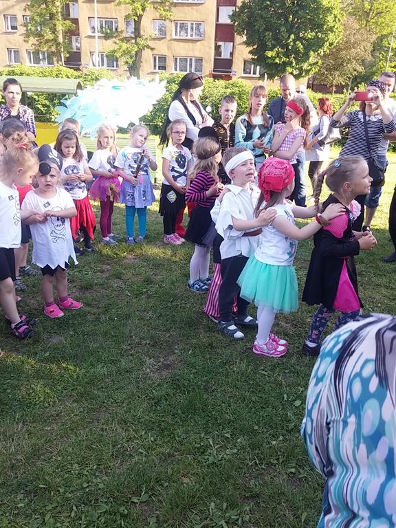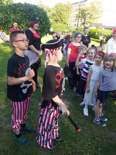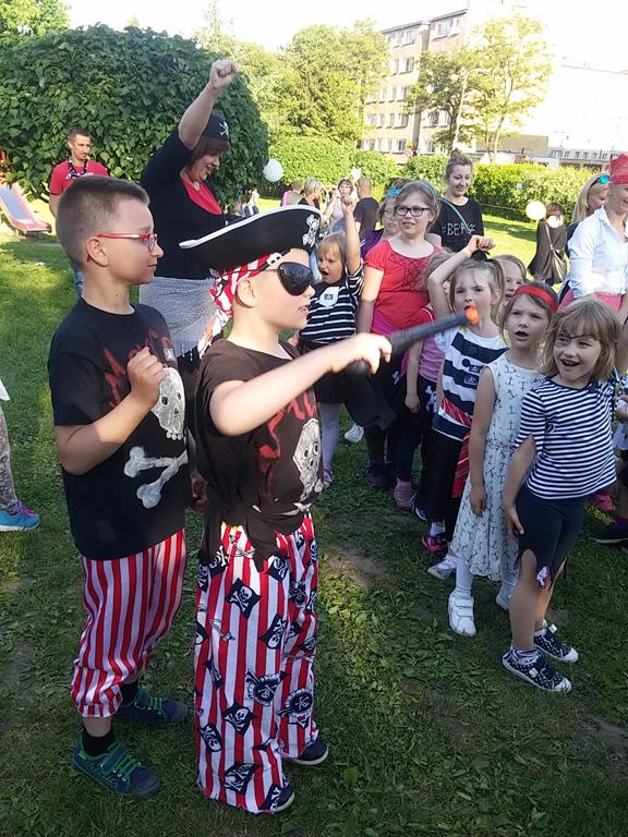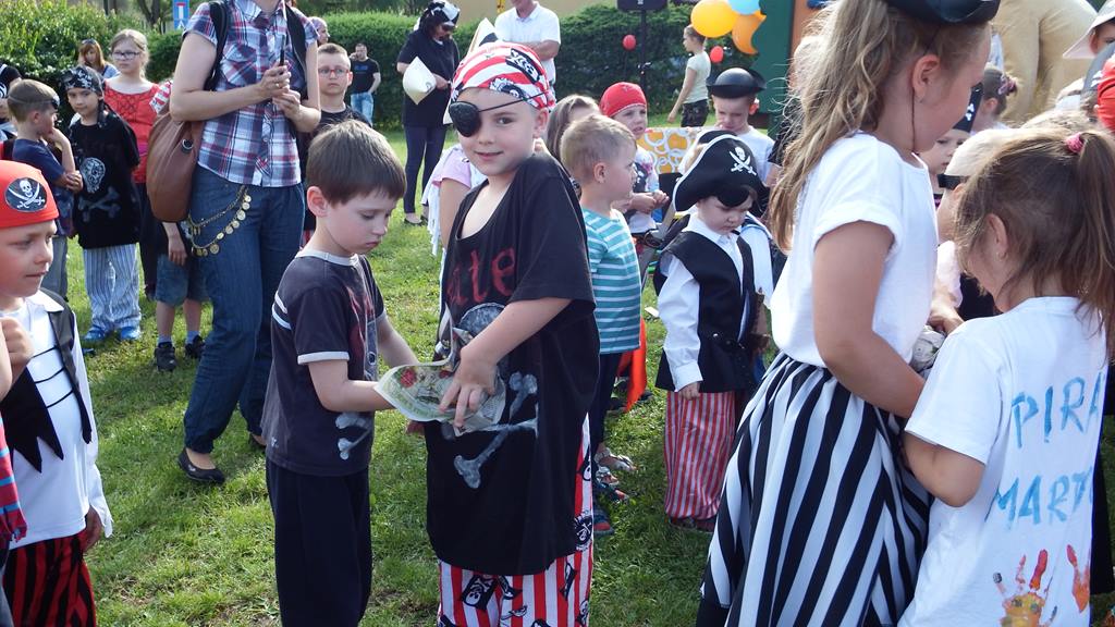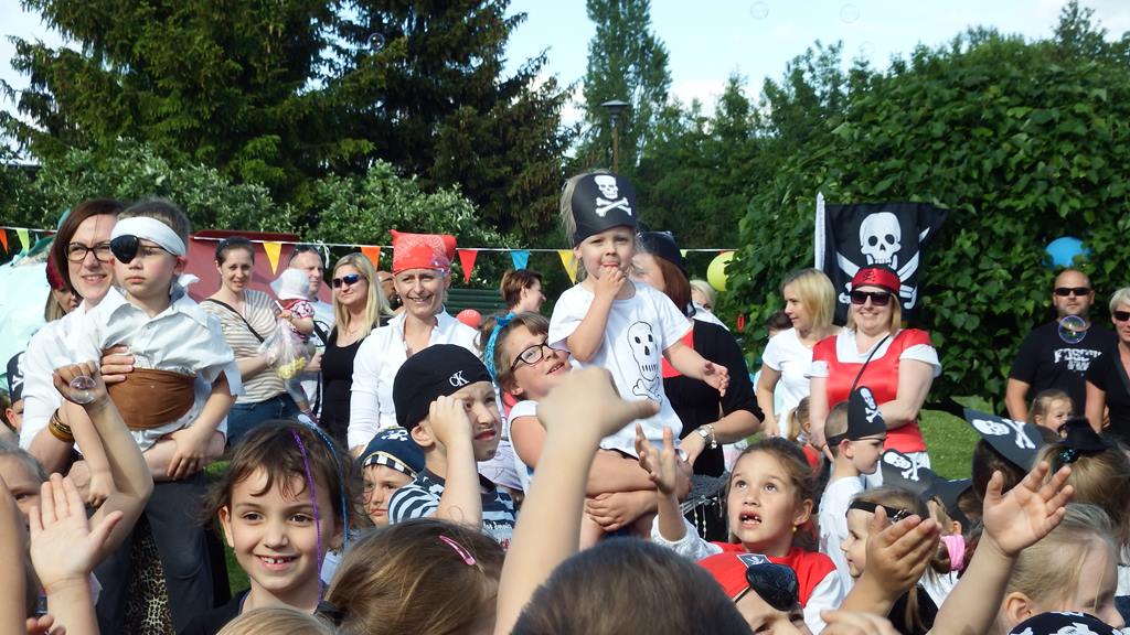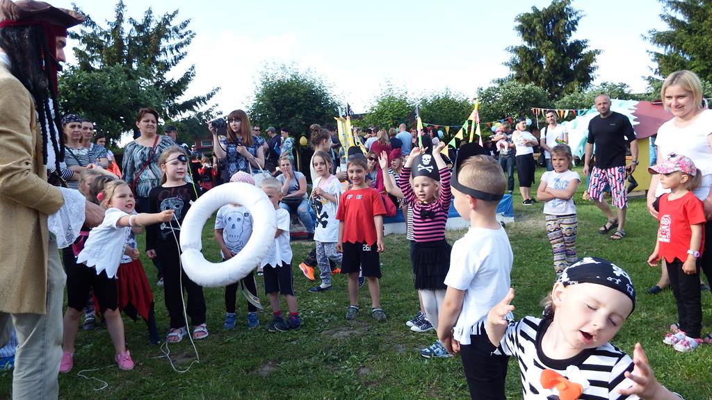 5 czerwca odbył się w naszym przedszkolu piknik rodzinny pod hasłem „Mamo, tato bądź piratem”. Rodzice wraz ze swoimi pociechami przygotowali sobie przebrania, aby wspólnie wyruszyć na wyprawę pod okiem kapitana Haka i Papużki Ary – animatorów z Koszalina. Na początku milusińscy pochwalili się swoimi umiejętnościami artystycznymi, zaśpiewali i złożyli swoim kochanym rodzicom życzenia. Później była zumba i wiele innych atrakcji dla rodziców i dzieci. Kulminacyjnym momentem było ogłoszenie przez Panią dyrektor wyników konkursu czytelniczego w grupach, w ramach akcji Cała Polska Czyta Dzieciom. Gratulacje dla najbardziej zaangażowanych rodziców otrzymali rodzice z grupy pani Hani i Pani Justyny – I miejsce, dla Pani Uli – II miejsce, dla Pani Kasi – III miejsce i IV miejsce – dla Pani Asi.