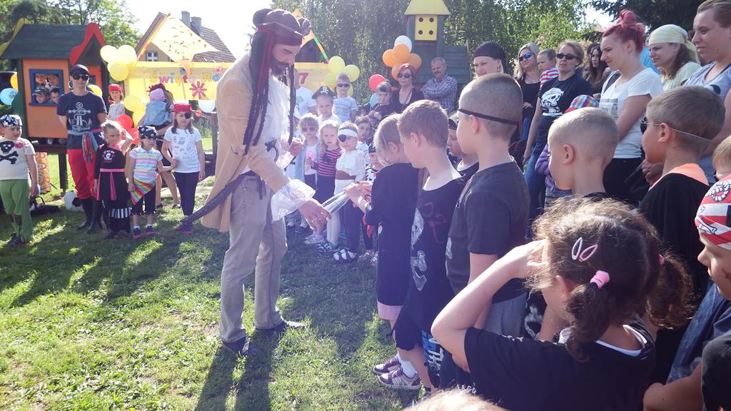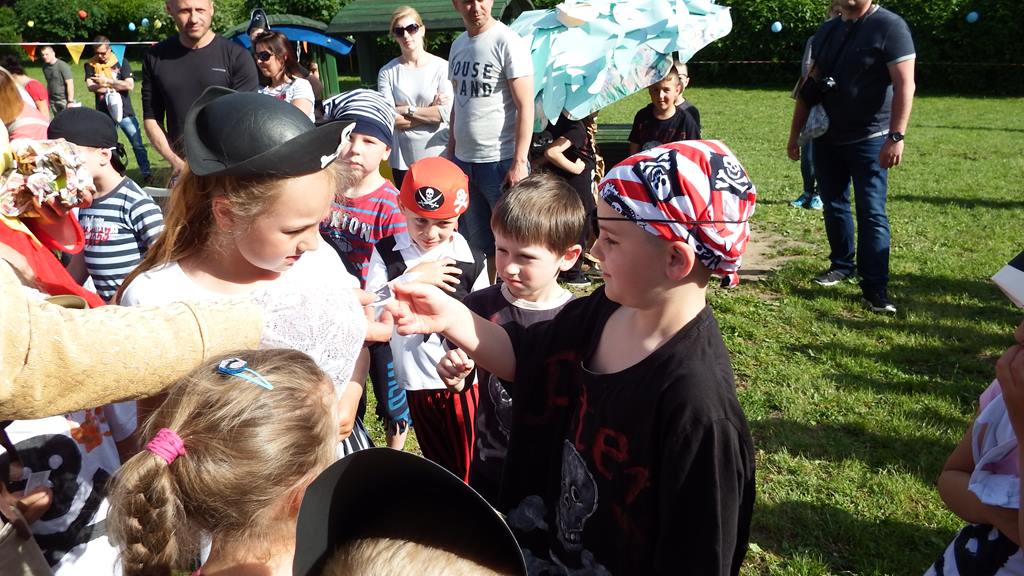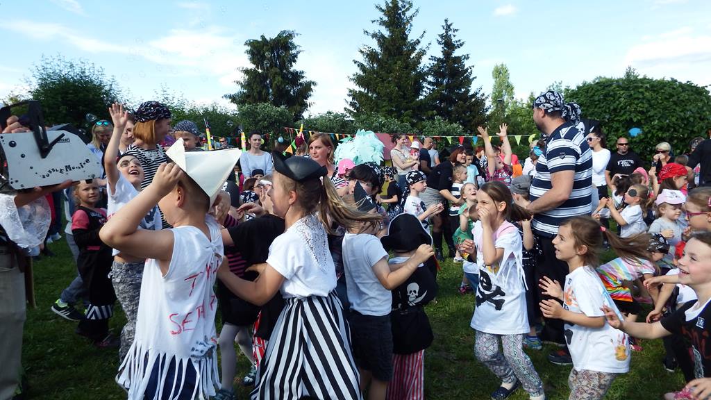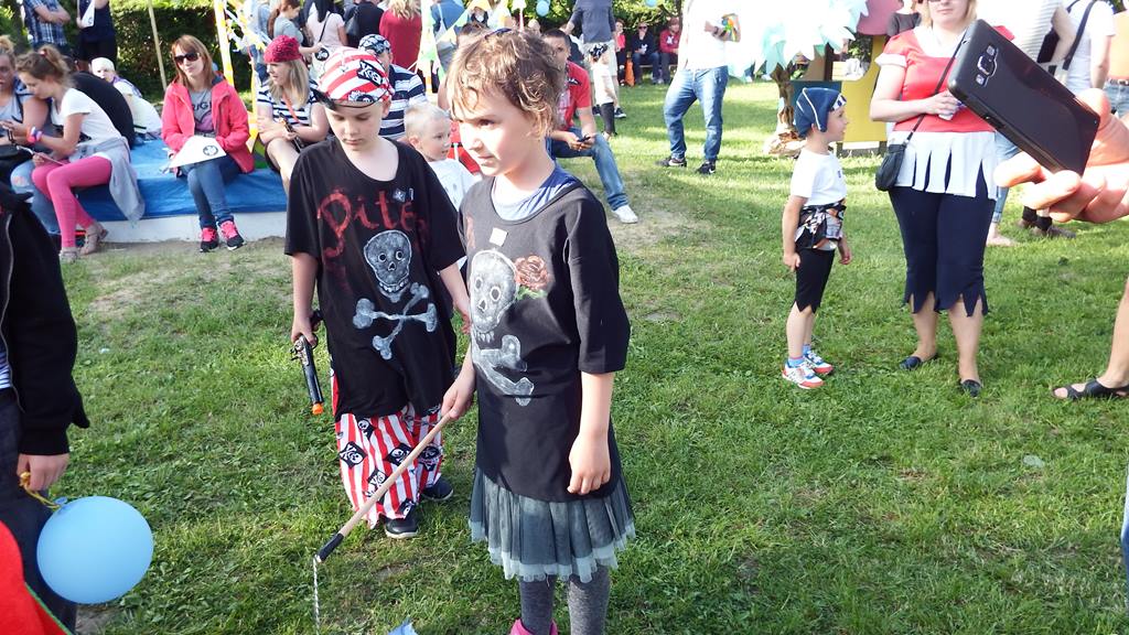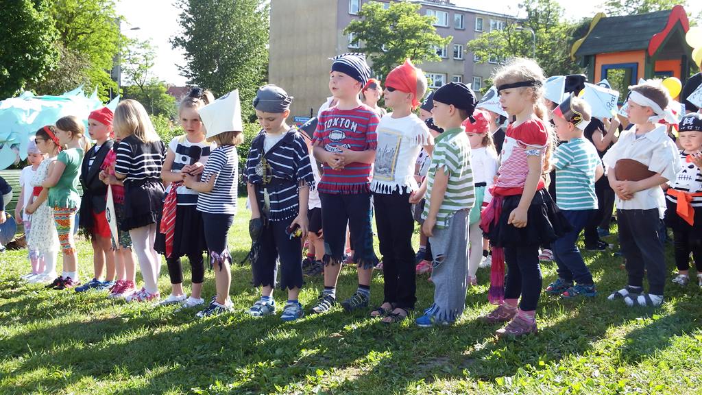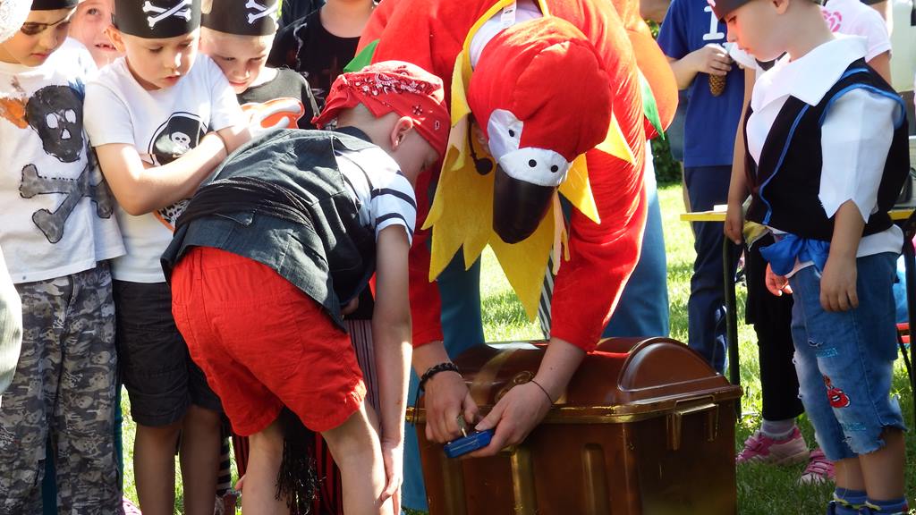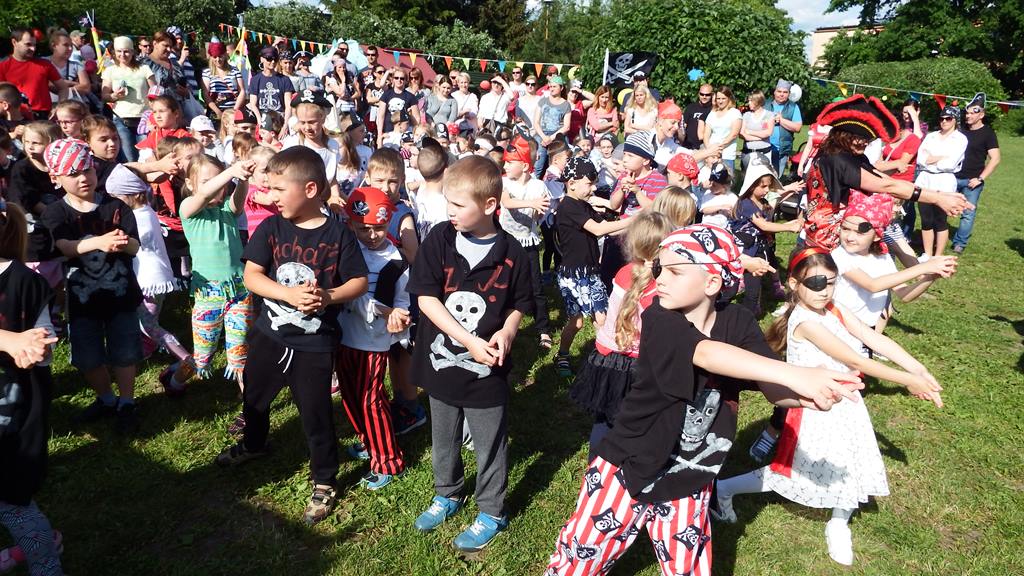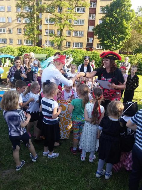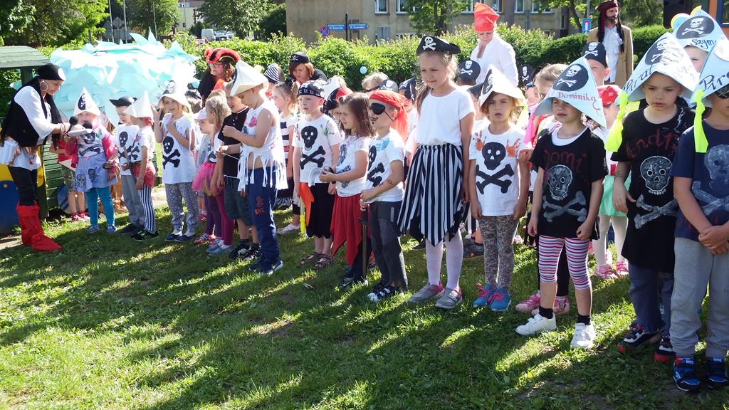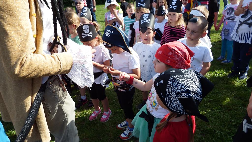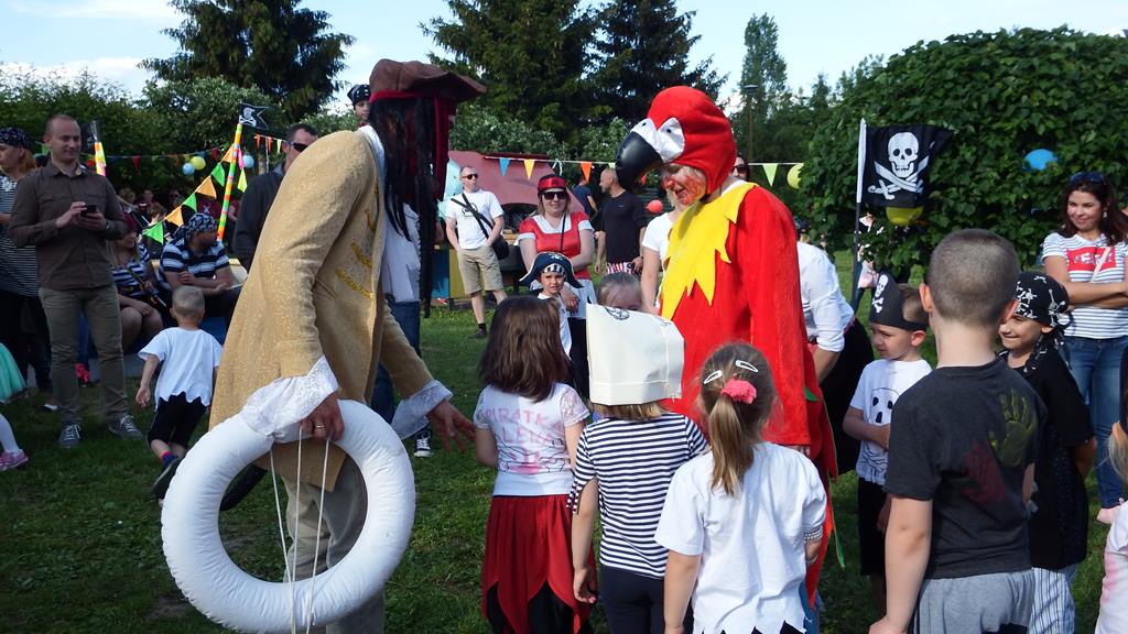 5 czerwca odbył się w naszym przedszkolu piknik rodzinny pod hasłem „Mamo, tato bądź piratem”. Rodzice wraz ze swoimi pociechami przygotowali sobie przebrania, aby wspólnie wyruszyć na wyprawę pod okiem kapitana Haka i Papużki Ary – animatorów z Koszalina. Na początku milusińscy pochwalili się swoimi umiejętnościami artystycznymi, zaśpiewali i złożyli swoim kochanym rodzicom życzenia. Później była zumba i wiele innych atrakcji dla rodziców i dzieci. Kulminacyjnym momentem było ogłoszenie przez Panią dyrektor wyników konkursu czytelniczego w grupach, w ramach akcji Cała Polska Czyta Dzieciom. Gratulacje dla najbardziej zaangażowanych rodziców otrzymali rodzice z grupy pani Hani i Pani Justyny – I miejsce, dla Pani Uli – II miejsce, dla Pani Kasi – III miejsce i IV miejsce – dla Pani Asi.