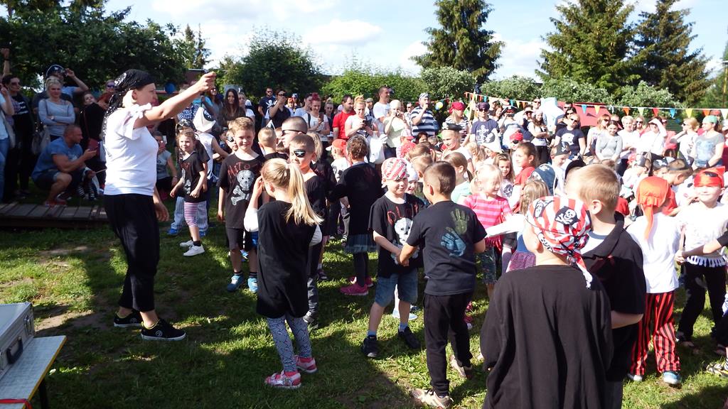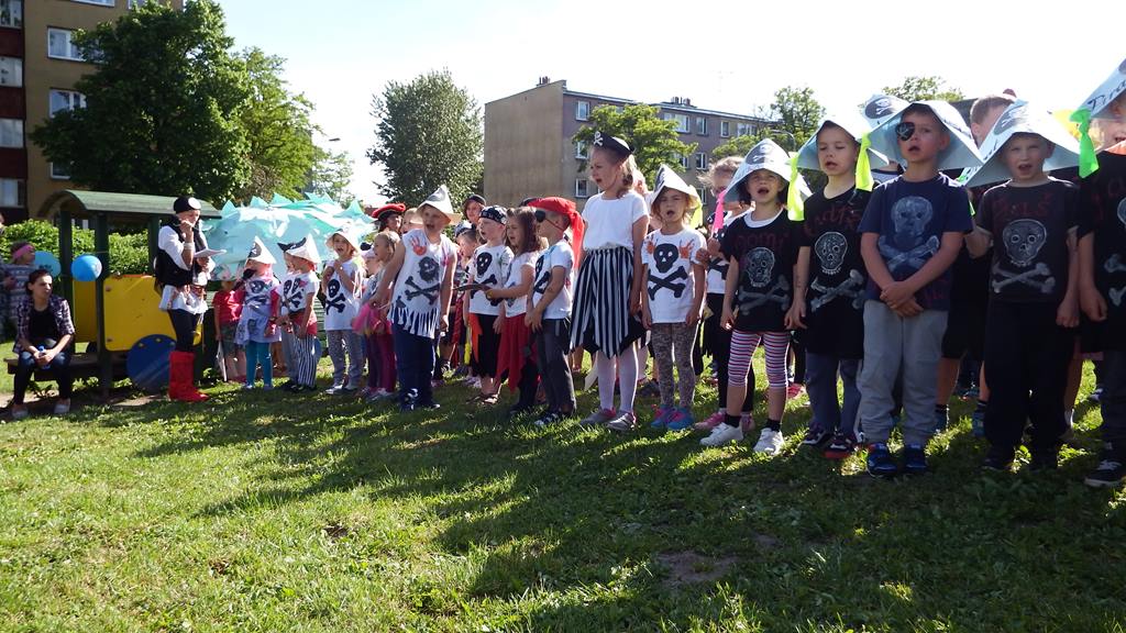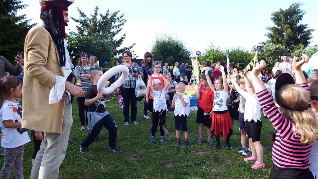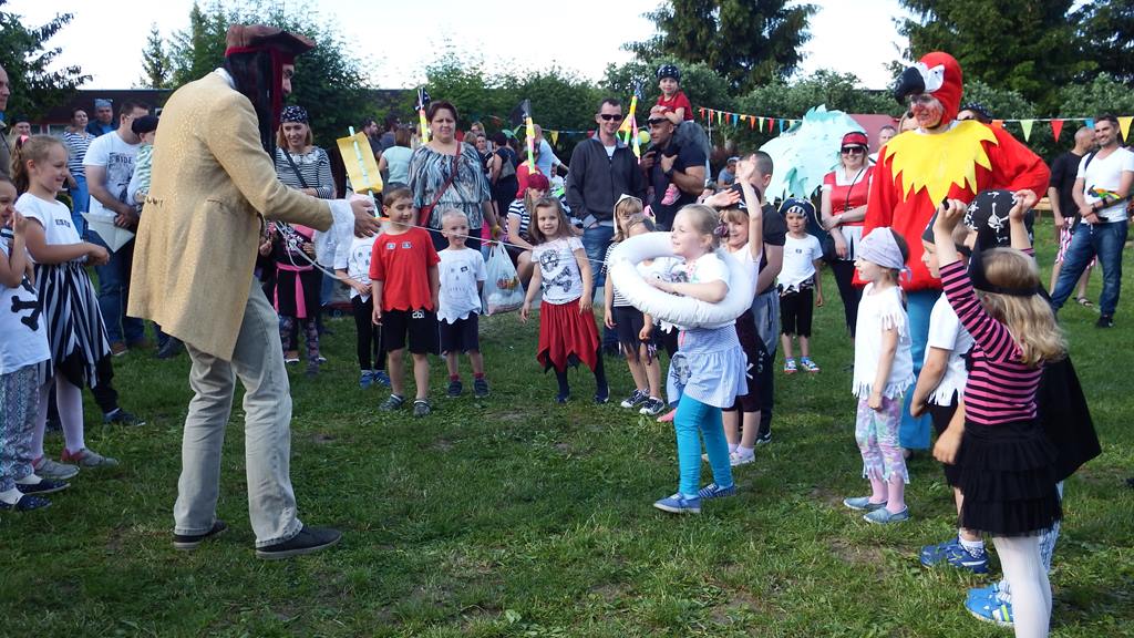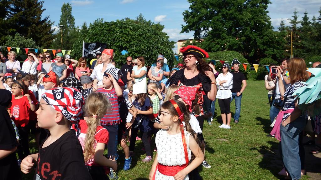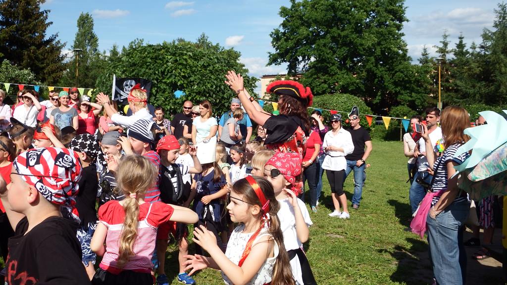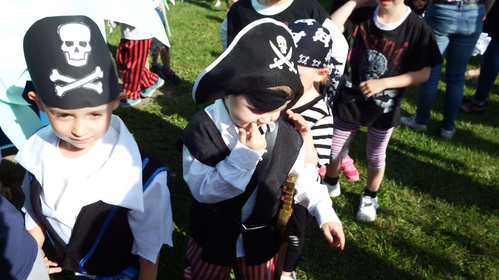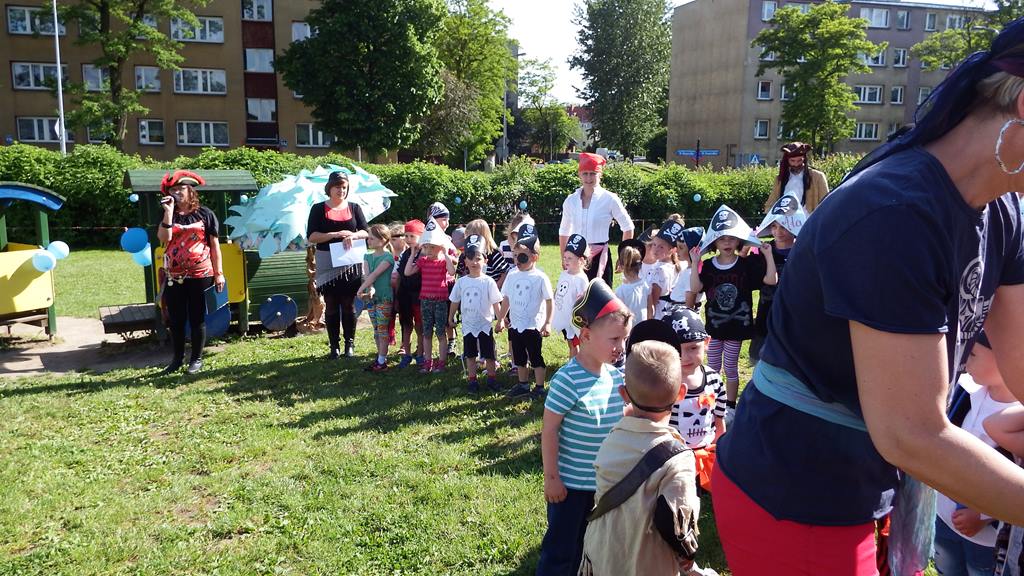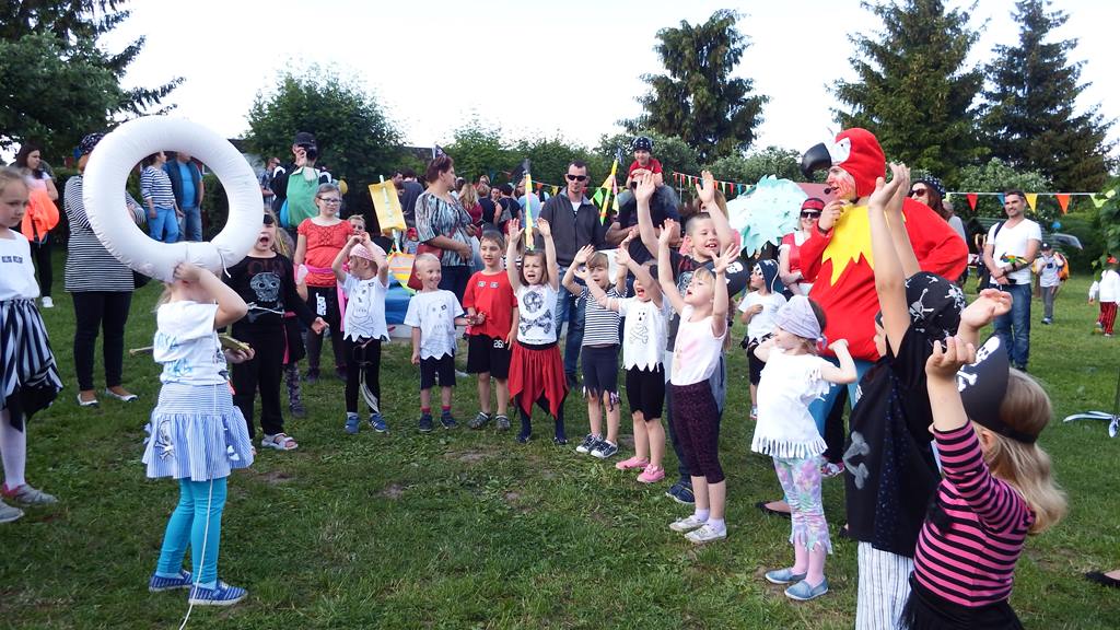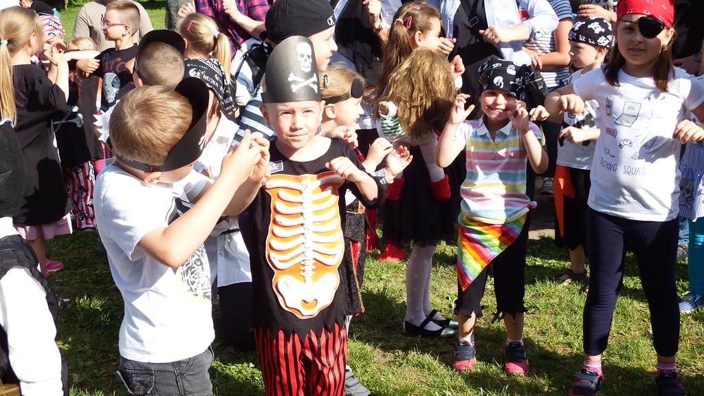 5 czerwca odbył się w naszym przedszkolu piknik rodzinny pod hasłem „Mamo, tato bądź piratem”. Rodzice wraz ze swoimi pociechami przygotowali sobie przebrania, aby wspólnie wyruszyć na wyprawę pod okiem kapitana Haka i Papużki Ary – animatorów z Koszalina. Na początku milusińscy pochwalili się swoimi umiejętnościami artystycznymi, zaśpiewali i złożyli swoim kochanym rodzicom życzenia. Później była zumba i wiele innych atrakcji dla rodziców i dzieci. Kulminacyjnym momentem było ogłoszenie przez Panią dyrektor wyników konkursu czytelniczego w grupach, w ramach akcji Cała Polska Czyta Dzieciom. Gratulacje dla najbardziej zaangażowanych rodziców otrzymali rodzice z grupy pani Hani i Pani Justyny – I miejsce, dla Pani Uli – II miejsce, dla Pani Kasi – III miejsce i IV miejsce – dla Pani Asi.