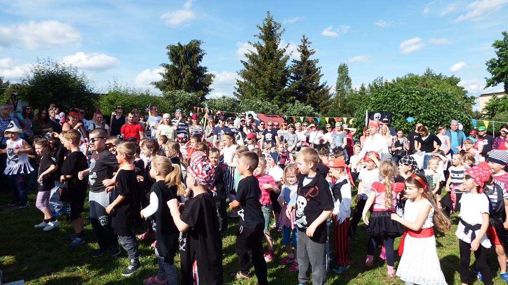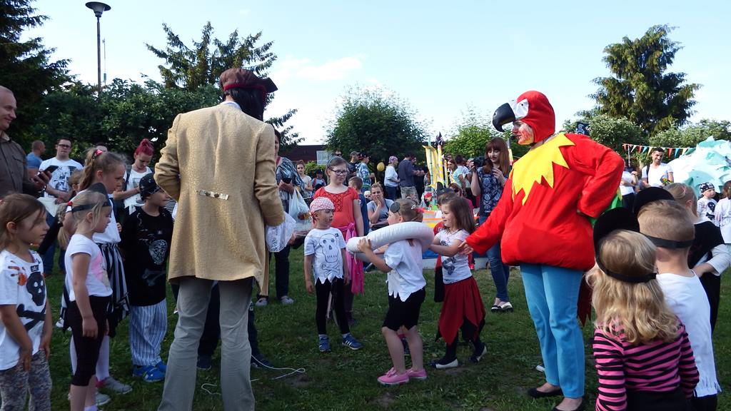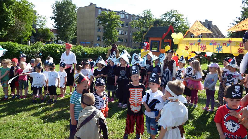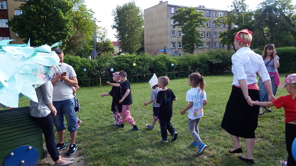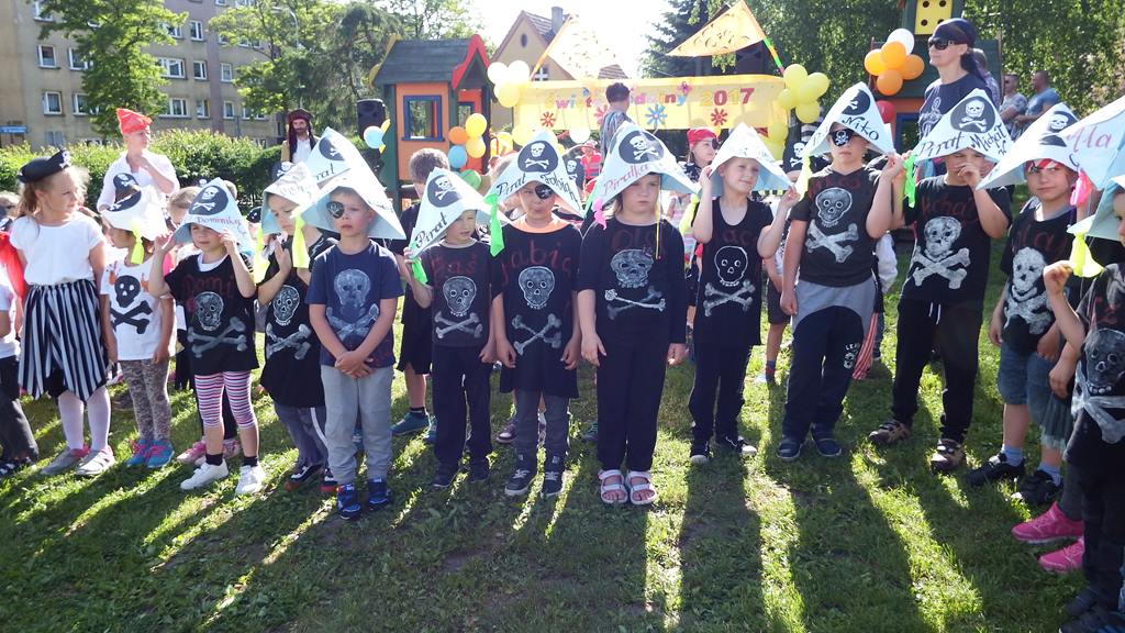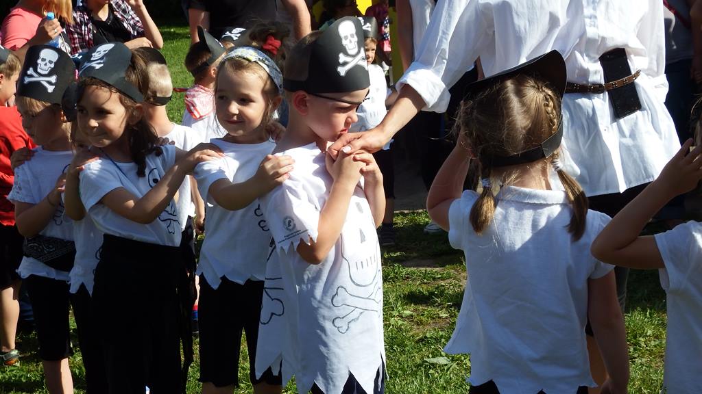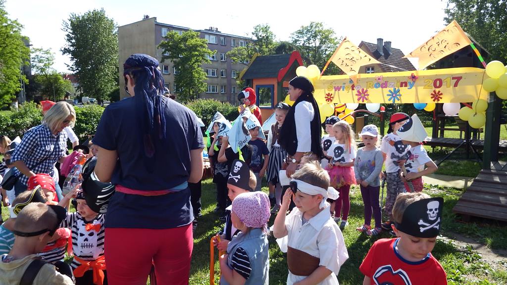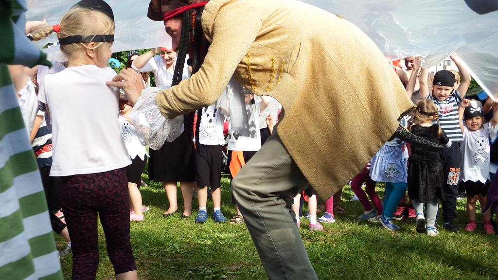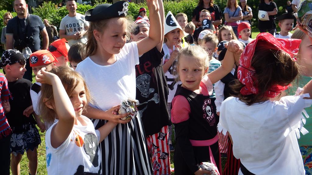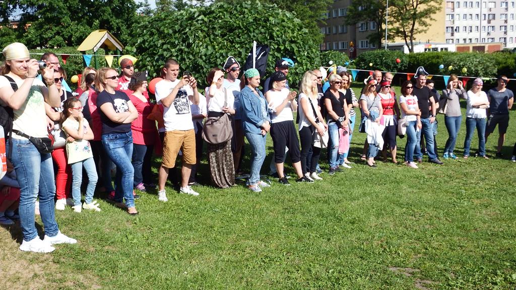 5 czerwca odbył się w naszym przedszkolu piknik rodzinny pod hasłem „Mamo, tato bądź piratem”. Rodzice wraz ze swoimi pociechami przygotowali sobie przebrania, aby wspólnie wyruszyć na wyprawę pod okiem kapitana Haka i Papużki Ary – animatorów z Koszalina. Na początku milusińscy pochwalili się swoimi umiejętnościami artystycznymi, zaśpiewali i złożyli swoim kochanym rodzicom życzenia. Później była zumba i wiele innych atrakcji dla rodziców i dzieci. Kulminacyjnym momentem było ogłoszenie przez Panią dyrektor wyników konkursu czytelniczego w grupach, w ramach akcji Cała Polska Czyta Dzieciom. Gratulacje dla najbardziej zaangażowanych rodziców otrzymali rodzice z grupy pani Hani i Pani Justyny – I miejsce, dla Pani Uli – II miejsce, dla Pani Kasi – III miejsce i IV miejsce – dla Pani Asi.