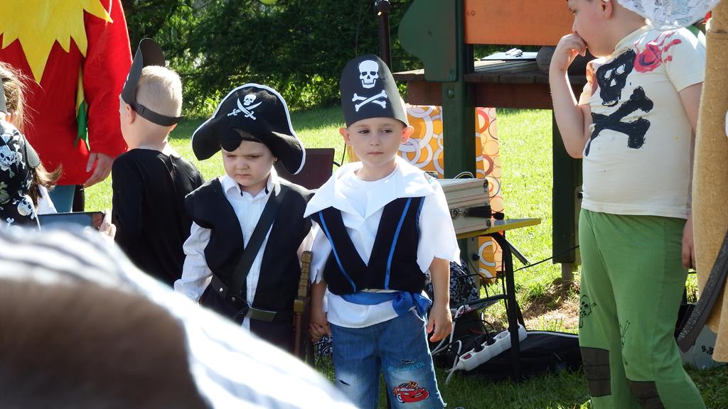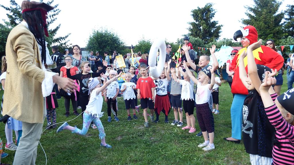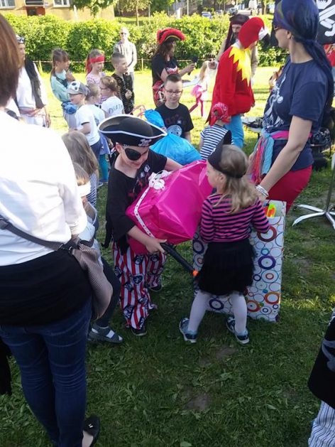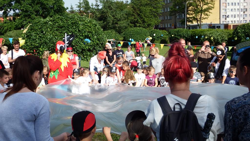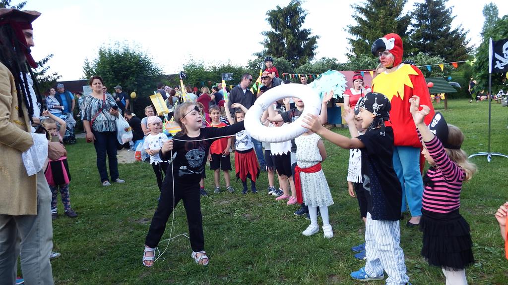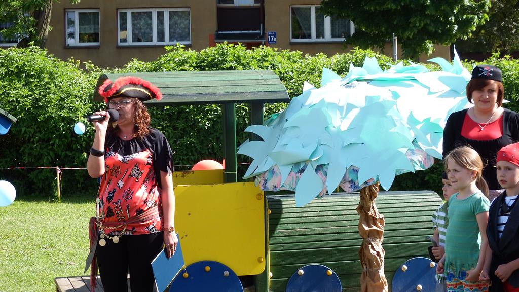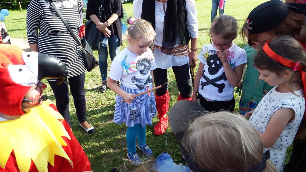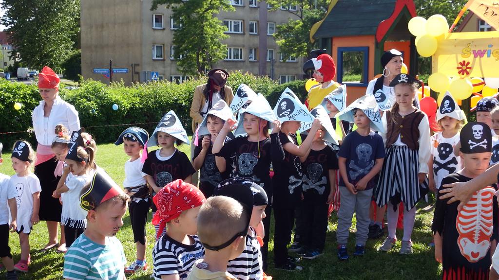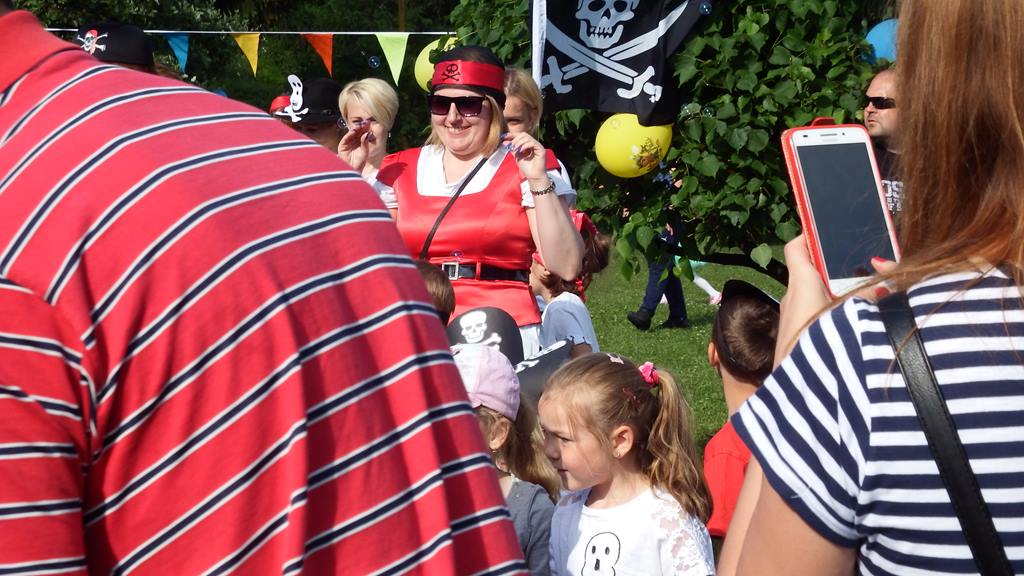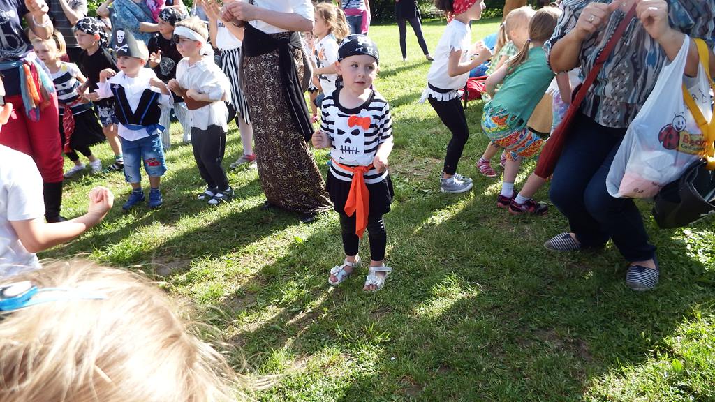 5 czerwca odbył się w naszym przedszkolu piknik rodzinny pod hasłem „Mamo, tato bądź piratem”. Rodzice wraz ze swoimi pociechami przygotowali sobie przebrania, aby wspólnie wyruszyć na wyprawę pod okiem kapitana Haka i Papużki Ary – animatorów z Koszalina. Na początku milusińscy pochwalili się swoimi umiejętnościami artystycznymi, zaśpiewali i złożyli swoim kochanym rodzicom życzenia. Później była zumba i wiele innych atrakcji dla rodziców i dzieci. Kulminacyjnym momentem było ogłoszenie przez Panią dyrektor wyników konkursu czytelniczego w grupach, w ramach akcji Cała Polska Czyta Dzieciom. Gratulacje dla najbardziej zaangażowanych rodziców otrzymali rodzice z grupy pani Hani i Pani Justyny – I miejsce, dla Pani Uli – II miejsce, dla Pani Kasi – III miejsce i IV miejsce – dla Pani Asi.