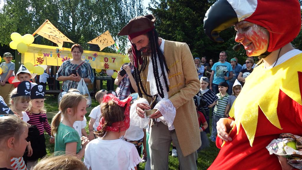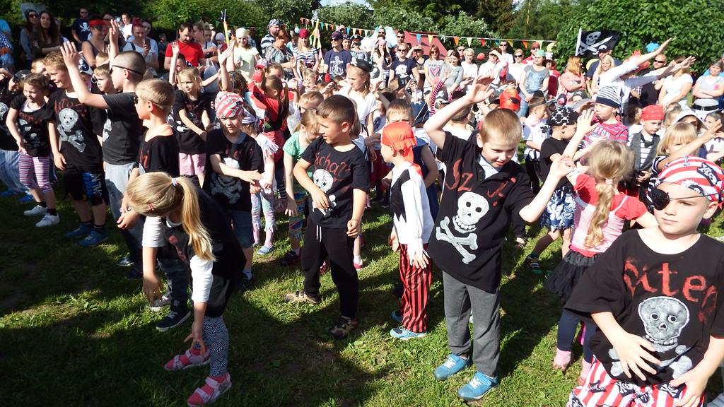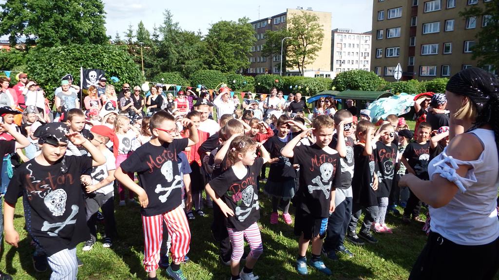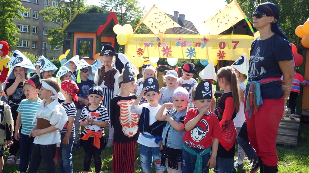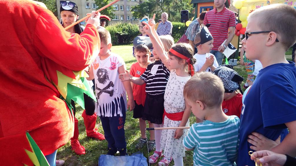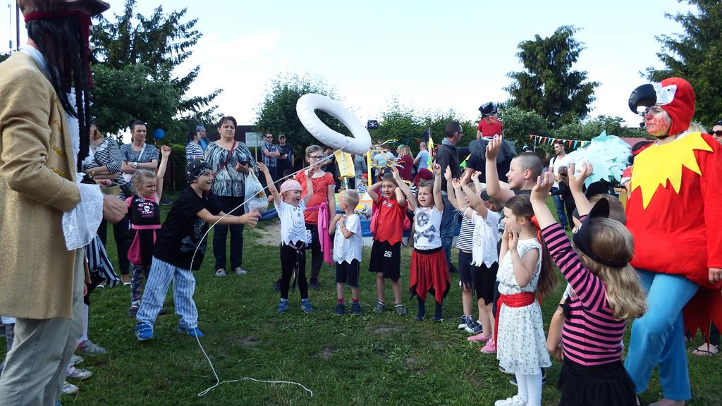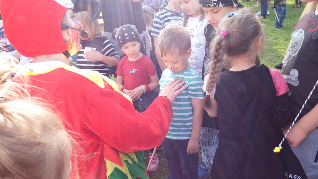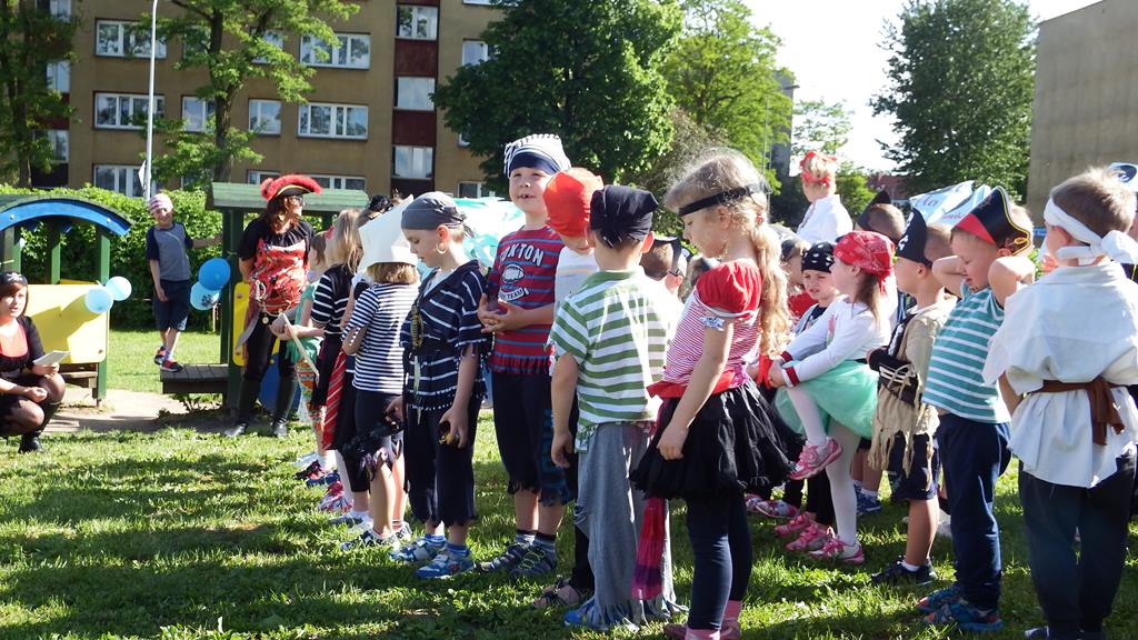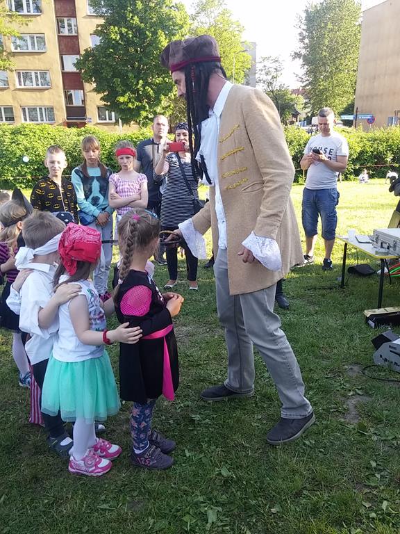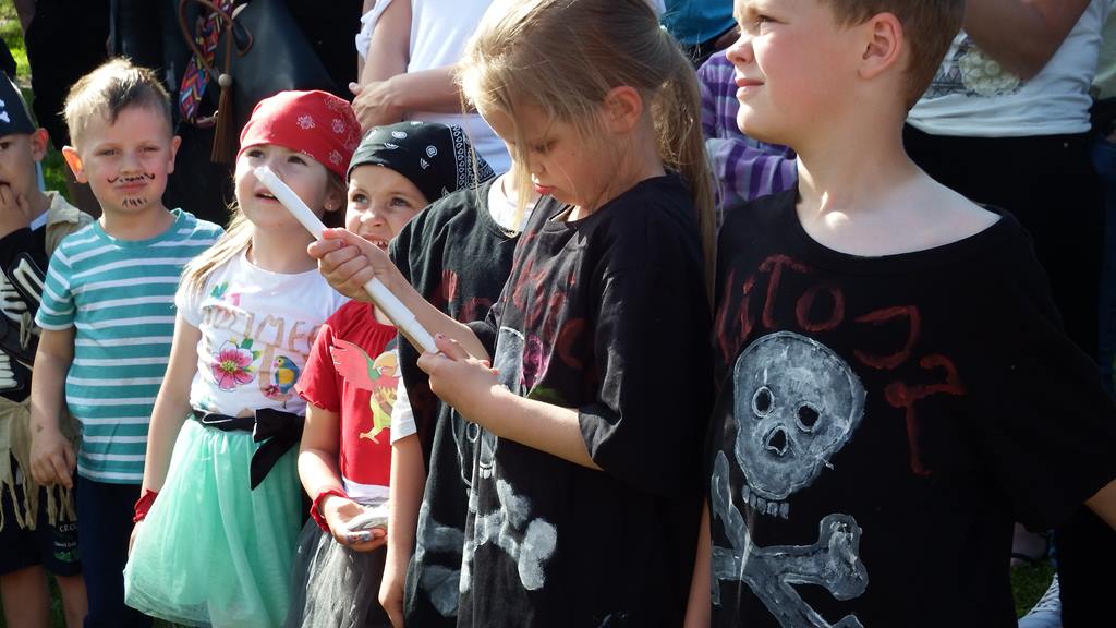 5 czerwca odbył się w naszym przedszkolu piknik rodzinny pod hasłem „Mamo, tato bądź piratem”. Rodzice wraz ze swoimi pociechami przygotowali sobie przebrania, aby wspólnie wyruszyć na wyprawę pod okiem kapitana Haka i Papużki Ary – animatorów z Koszalina. Na początku milusińscy pochwalili się swoimi umiejętnościami artystycznymi, zaśpiewali i złożyli swoim kochanym rodzicom życzenia. Później była zumba i wiele innych atrakcji dla rodziców i dzieci. Kulminacyjnym momentem było ogłoszenie przez Panią dyrektor wyników konkursu czytelniczego w grupach, w ramach akcji Cała Polska Czyta Dzieciom. Gratulacje dla najbardziej zaangażowanych rodziców otrzymali rodzice z grupy pani Hani i Pani Justyny – I miejsce, dla Pani Uli – II miejsce, dla Pani Kasi – III miejsce i IV miejsce – dla Pani Asi.