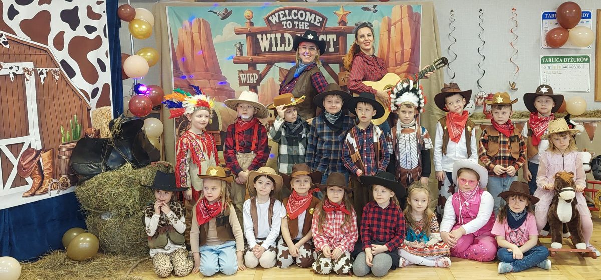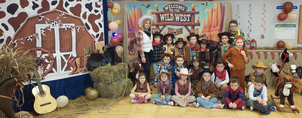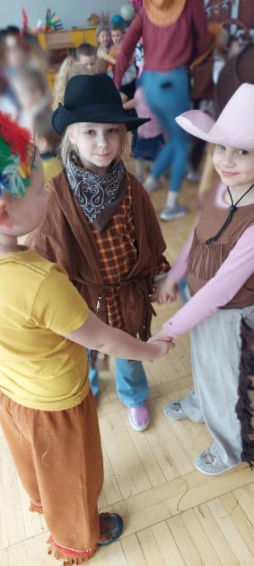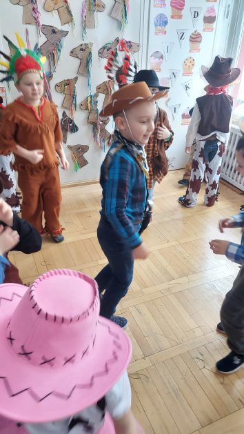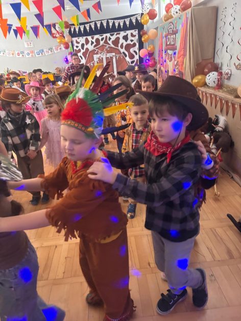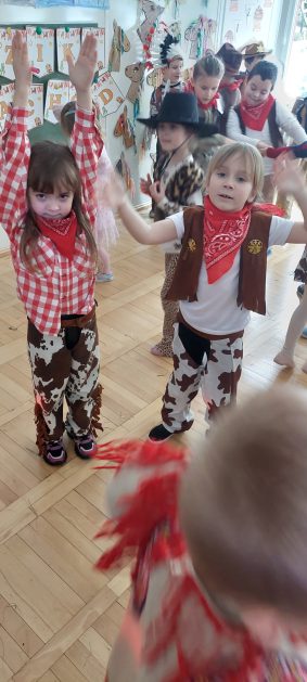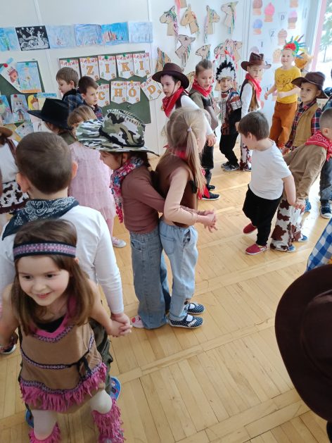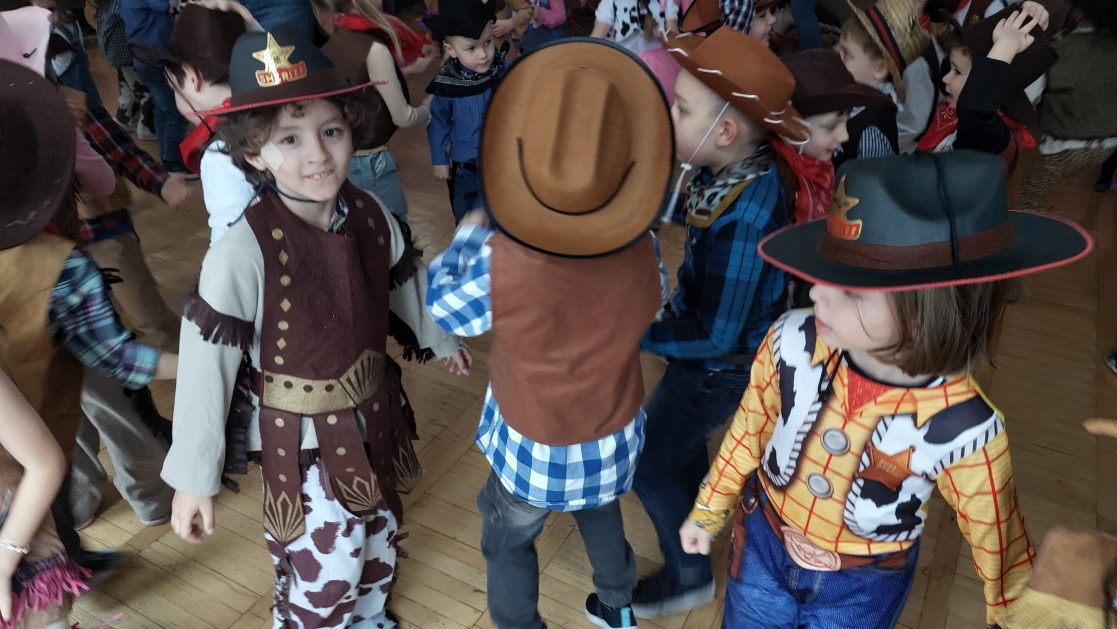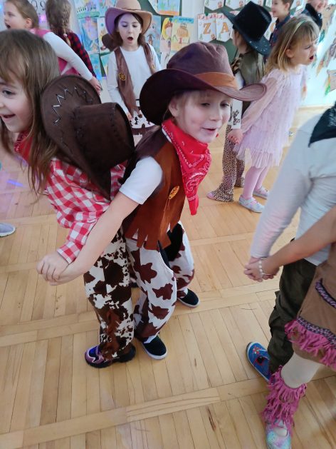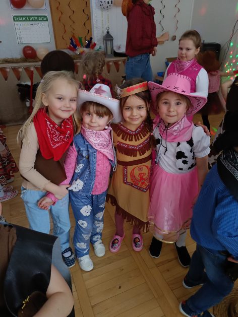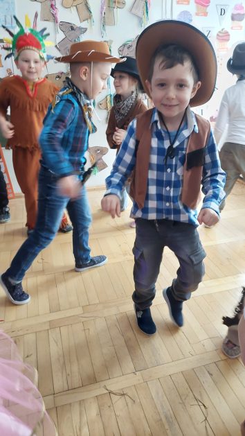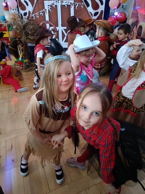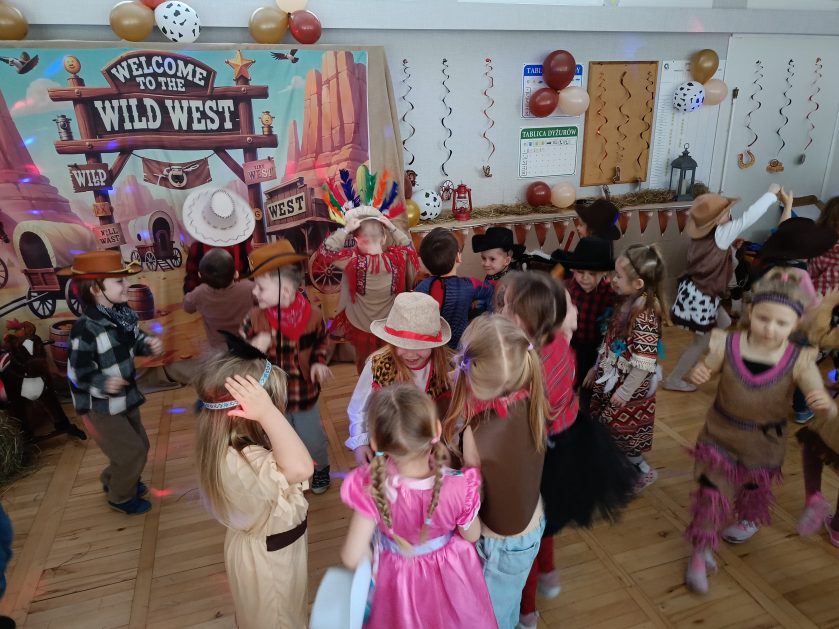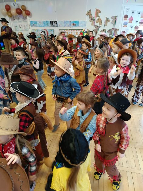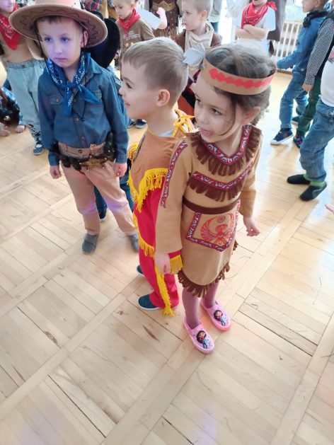 W tym roku u nas w przedszkolu tematem przewodnim na balu był „ Dziki zachód”, zatem na parkiecie królowali kowboje, szeryfowie oraz Indianie i Indianki. Przedszkolaki brały udział w zabawach tanecznych do znanych utworów muzyki country. Młodzi kowboje i kowbojki mieli okazję, uczestniczyć w różnych konkurencjach. Radość i energia tryskały z każdego zakątka sali! Przerywnikiem był słodki poczęstunek.