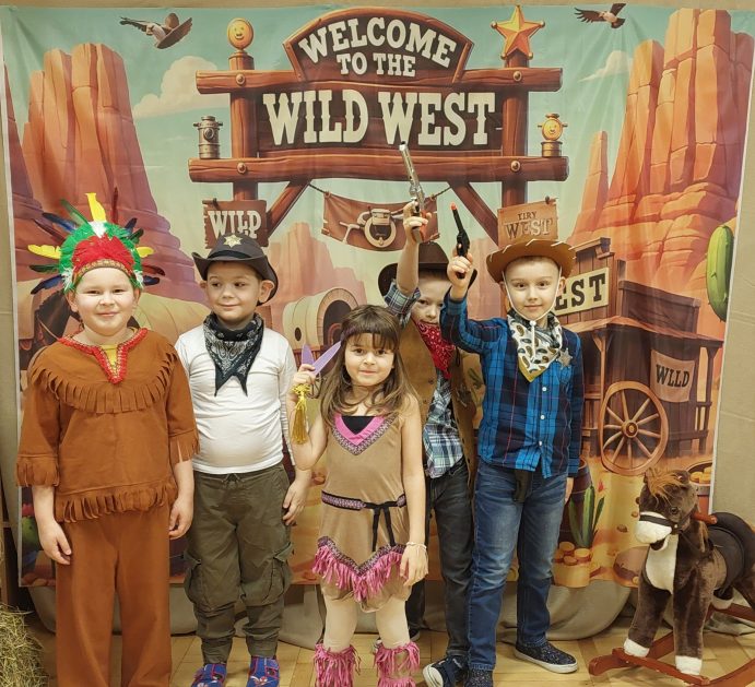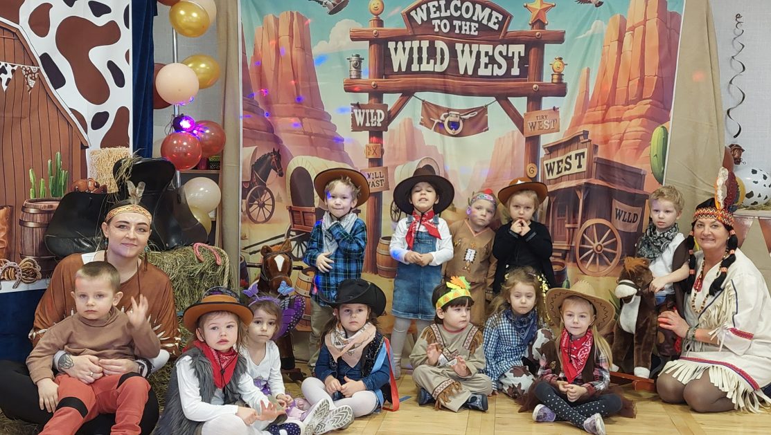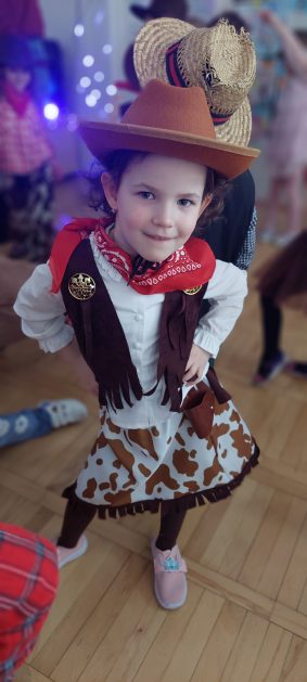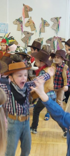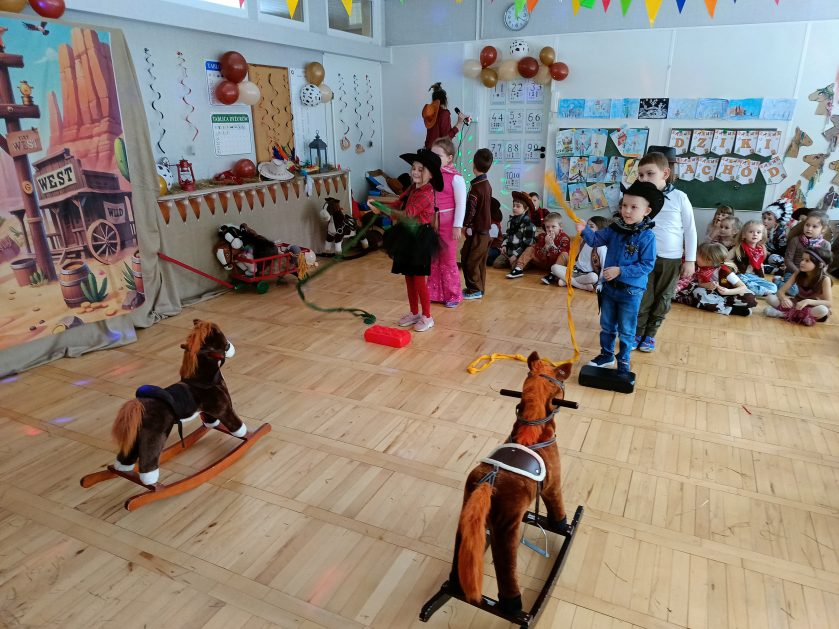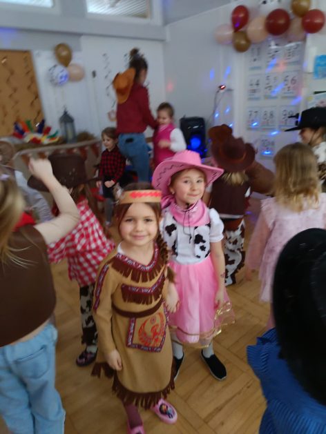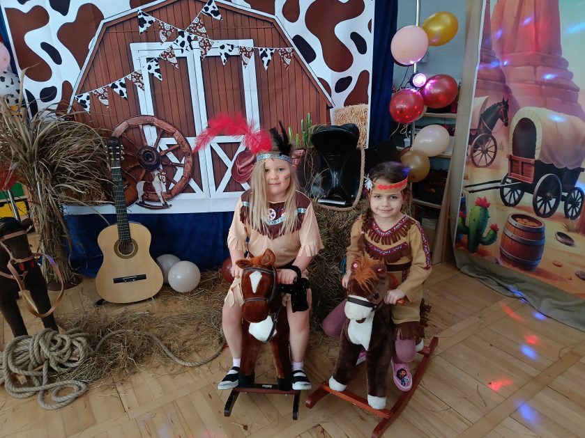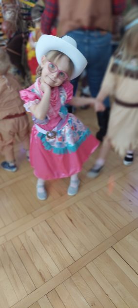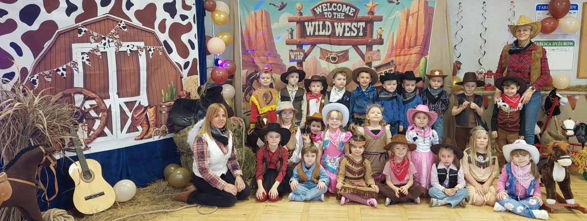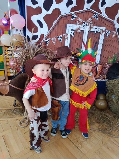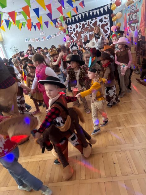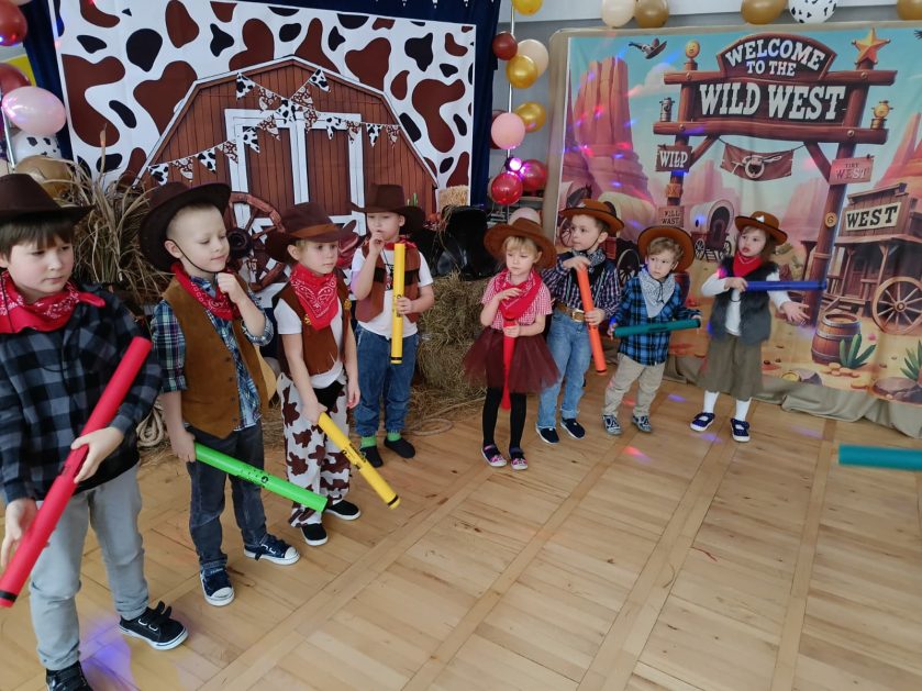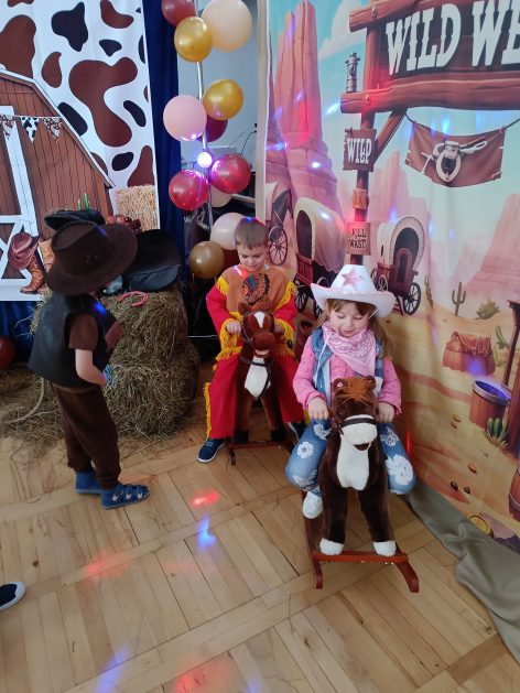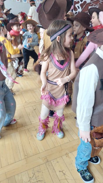 W tym roku u nas w przedszkolu tematem przewodnim na balu był „ Dziki zachód”, zatem na parkiecie królowali kowboje, szeryfowie oraz Indianie i Indianki. Przedszkolaki brały udział w zabawach tanecznych do znanych utworów muzyki country. Młodzi kowboje i kowbojki mieli okazję, uczestniczyć w różnych konkurencjach. Radość i energia tryskały z każdego zakątka sali! Przerywnikiem był słodki poczęstunek.