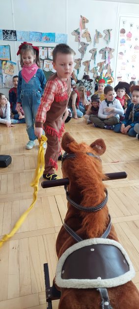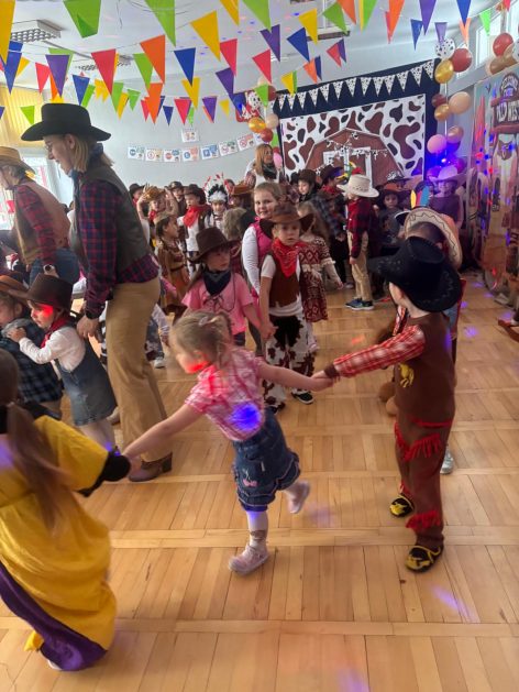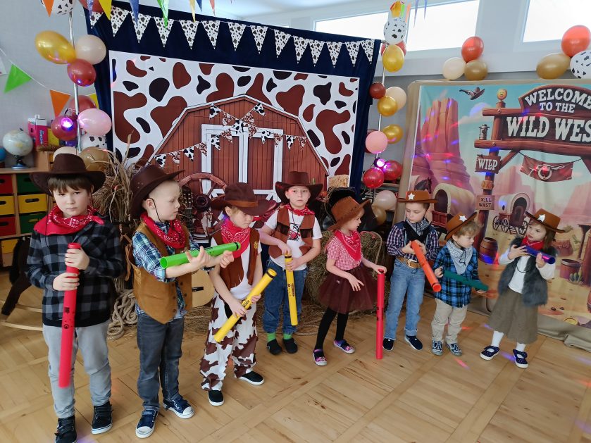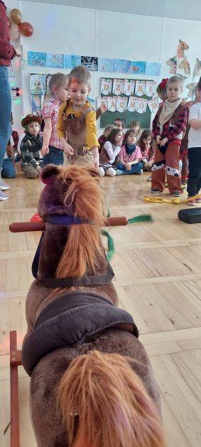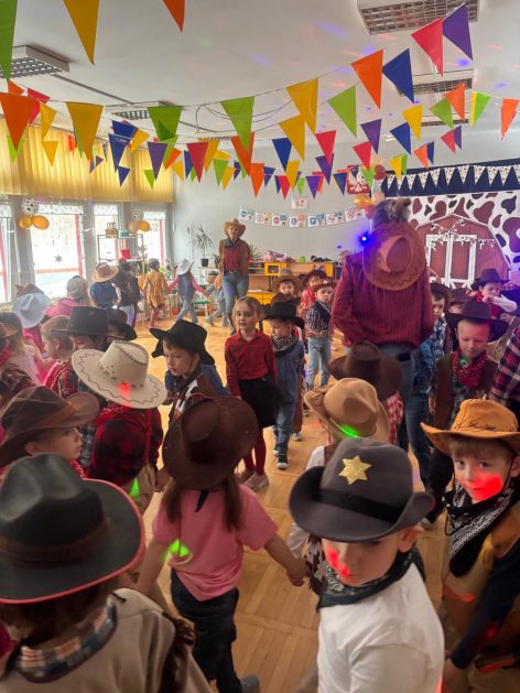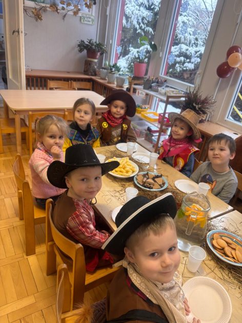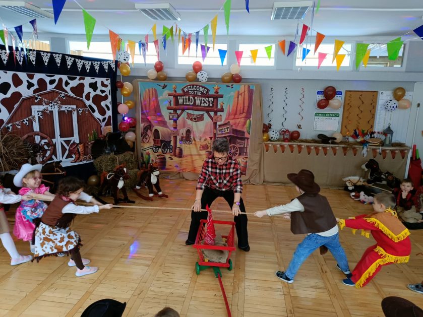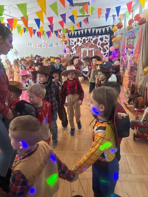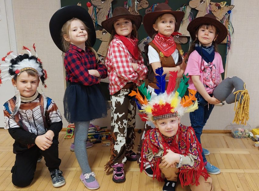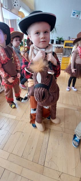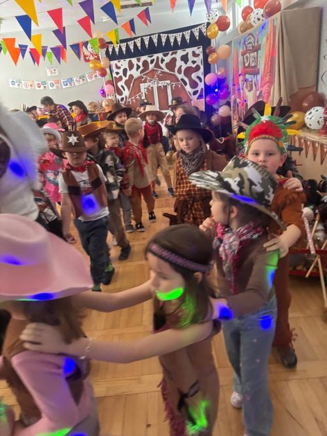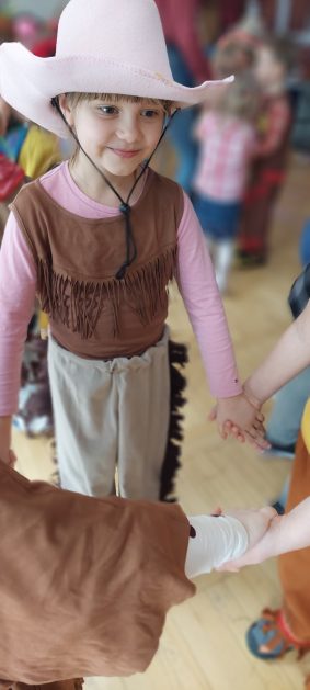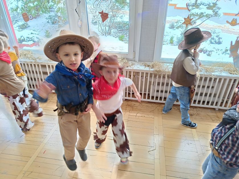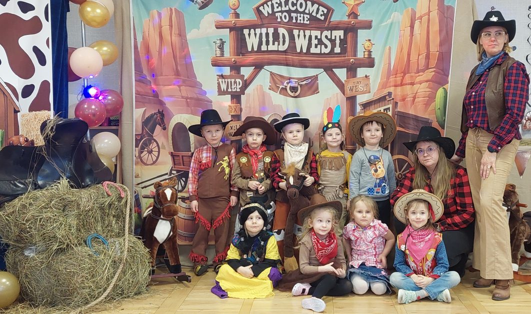 W tym roku u nas w przedszkolu tematem przewodnim na balu był „ Dziki zachód”, zatem na parkiecie królowali kowboje, szeryfowie oraz Indianie i Indianki. Przedszkolaki brały udział w zabawach tanecznych do znanych utworów muzyki country. Młodzi kowboje i kowbojki mieli okazję, uczestniczyć w różnych konkurencjach. Radość i energia tryskały z każdego zakątka sali! Przerywnikiem był słodki poczęstunek.