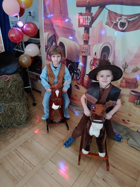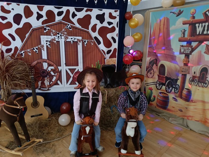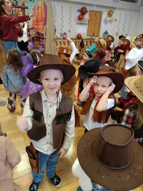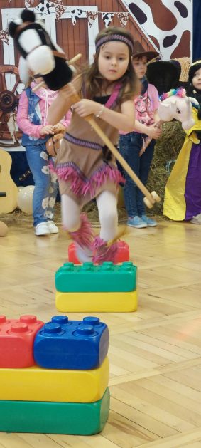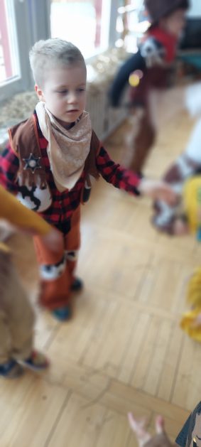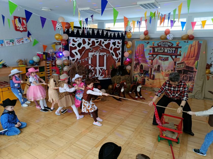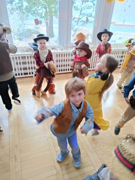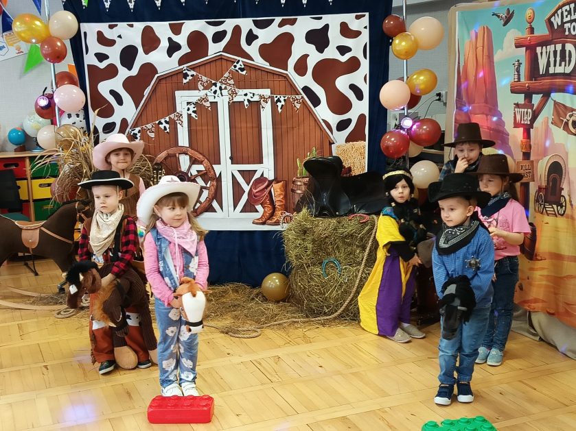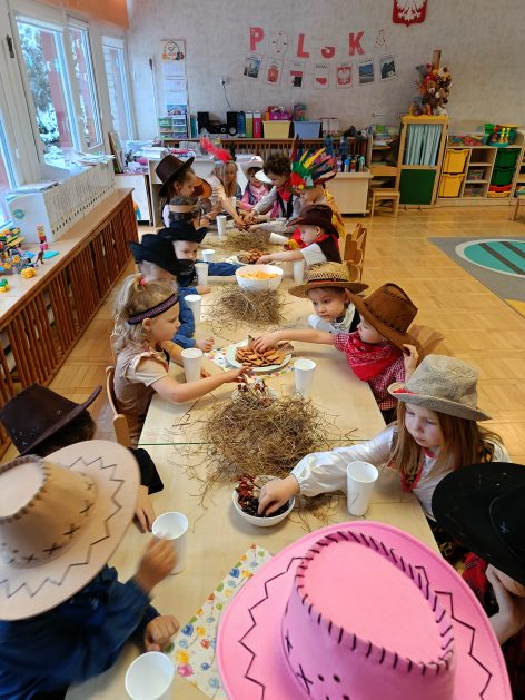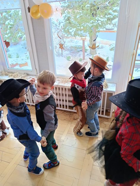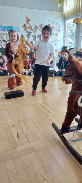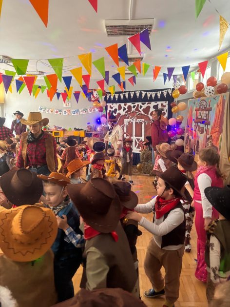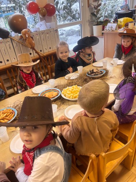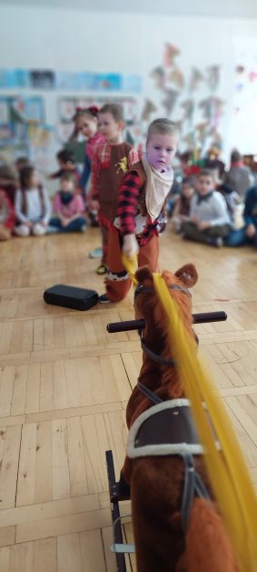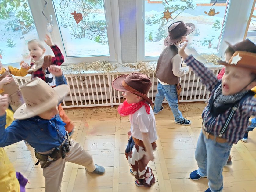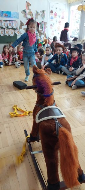 W tym roku u nas w przedszkolu tematem przewodnim na balu był „ Dziki zachód”, zatem na parkiecie królowali kowboje, szeryfowie oraz Indianie i Indianki. Przedszkolaki brały udział w zabawach tanecznych do znanych utworów muzyki country. Młodzi kowboje i kowbojki mieli okazję, uczestniczyć w różnych konkurencjach. Radość i energia tryskały z każdego zakątka sali! Przerywnikiem był słodki poczęstunek.