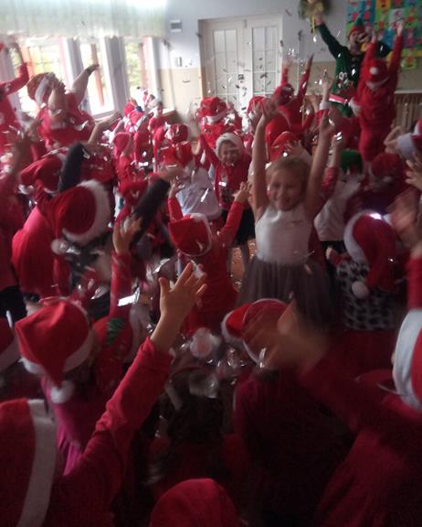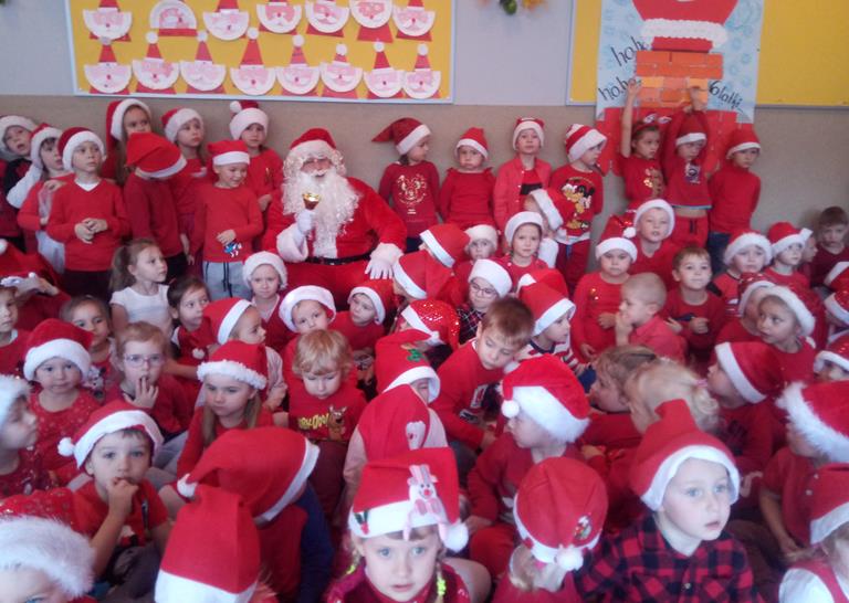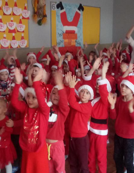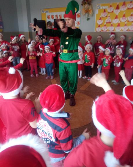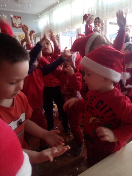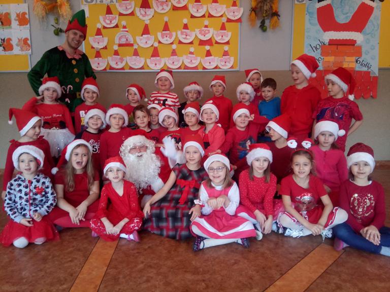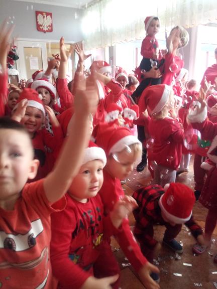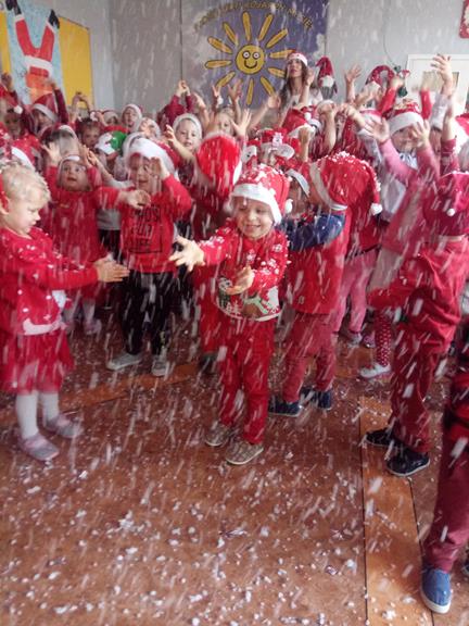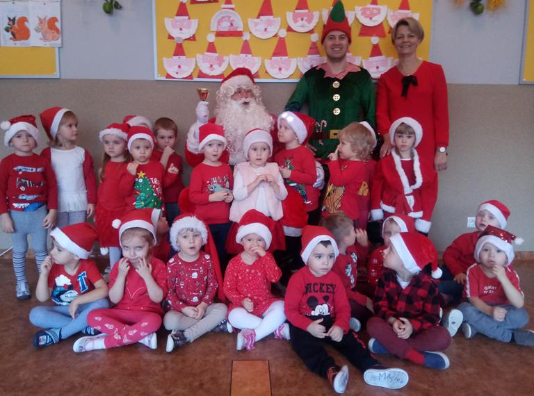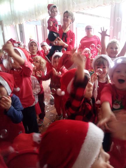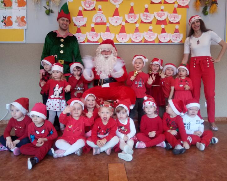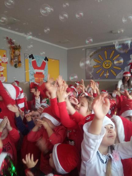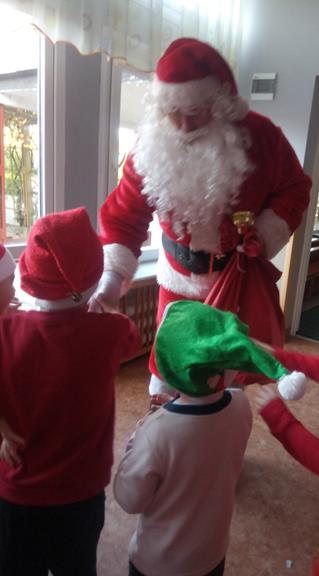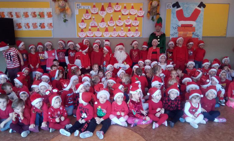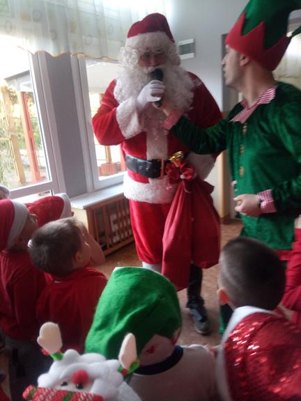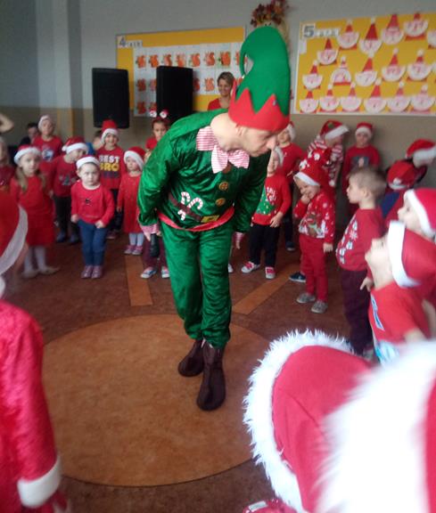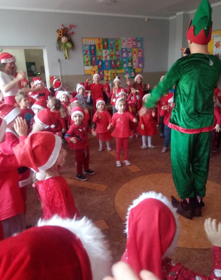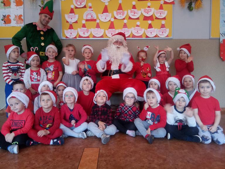 Do naszego przedszkola Mikołaj zawitał już 5 grudnia. Wszyscy byli przygotowani, ubrani w ulubiony kolor Mikołaja. Gdy zebraliśmy się w jednym miejscu zrobiło się czerwono!!! Dzieci oczekiwały gościa wraz z elfem – DJ Przemo. Niespodziewanie usłyszały charakterystyczny dźwięk dzwonka i okrzyk: „ Ho, ho, ho przedszkolaki!!!” Mikołaj oprócz małych niespodzianek przywiózł kolorowe bańki i ….. pierwszy śnieg. Wraz z dziećmi bawił się wesoło, zrobił pamiątkowe zdjęcia i niestety wyruszył w dalszą drogę…