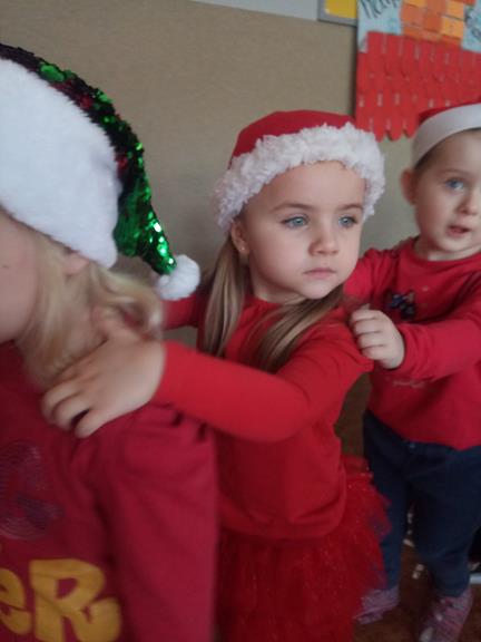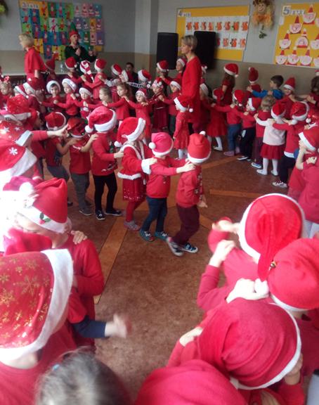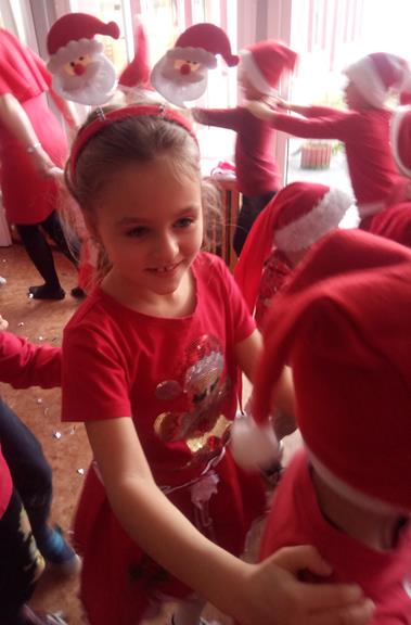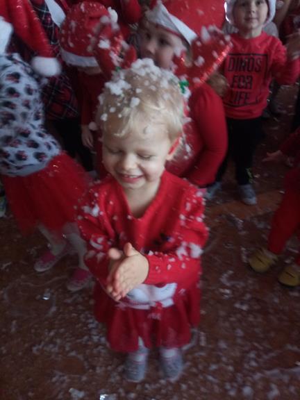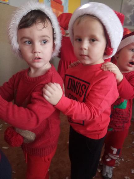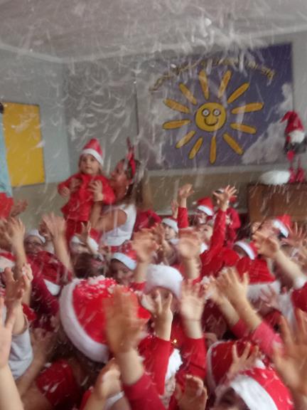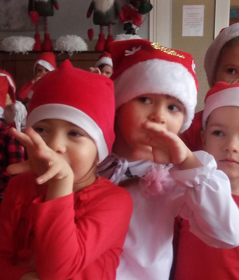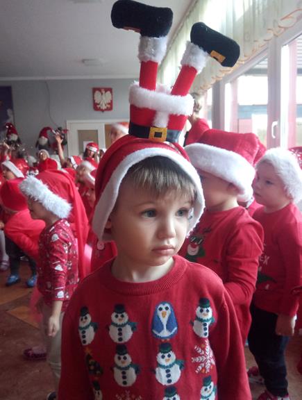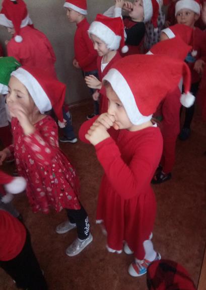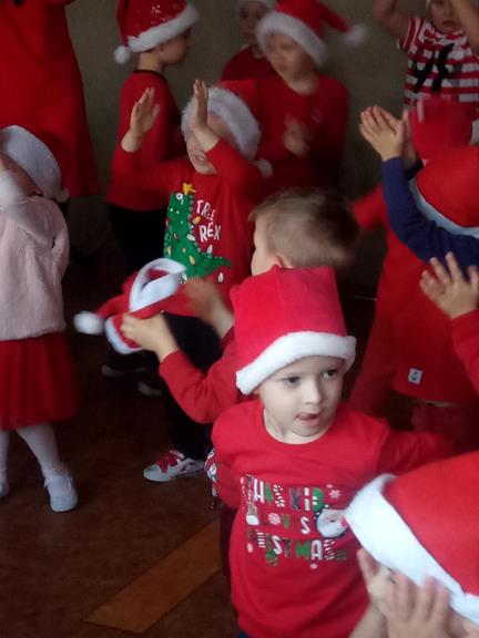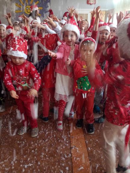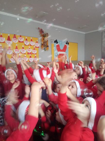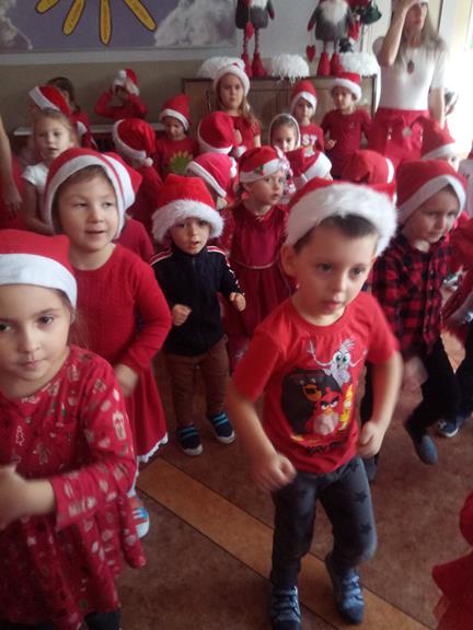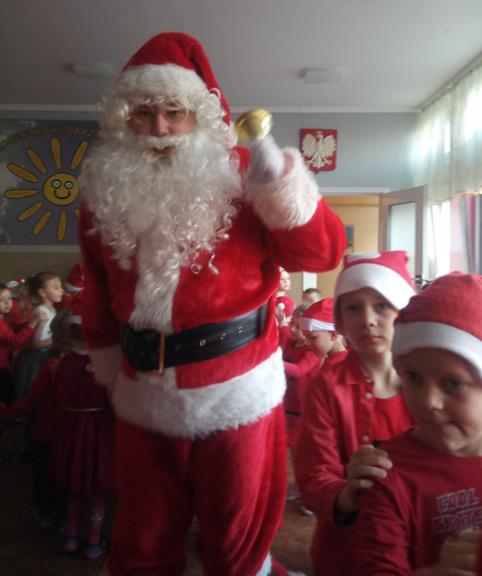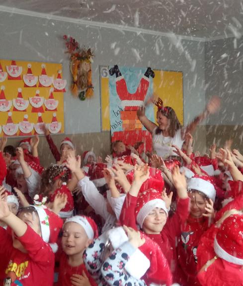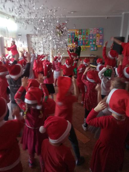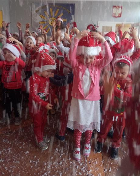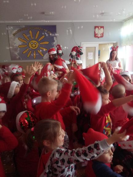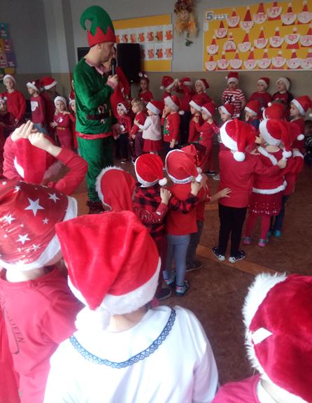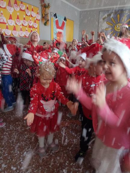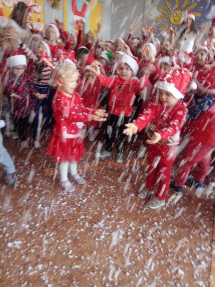 Do naszego przedszkola Mikołaj zawitał już 5 grudnia. Wszyscy byli przygotowani, ubrani w ulubiony kolor Mikołaja. Gdy zebraliśmy się w jednym miejscu zrobiło się czerwono!!! Dzieci oczekiwały gościa wraz z elfem – DJ Przemo. Niespodziewanie usłyszały charakterystyczny dźwięk dzwonka i okrzyk: „ Ho, ho, ho przedszkolaki!!!” Mikołaj oprócz małych niespodzianek przywiózł kolorowe bańki i ….. pierwszy śnieg. Wraz z dziećmi bawił się wesoło, zrobił pamiątkowe zdjęcia i niestety wyruszył w dalszą drogę…