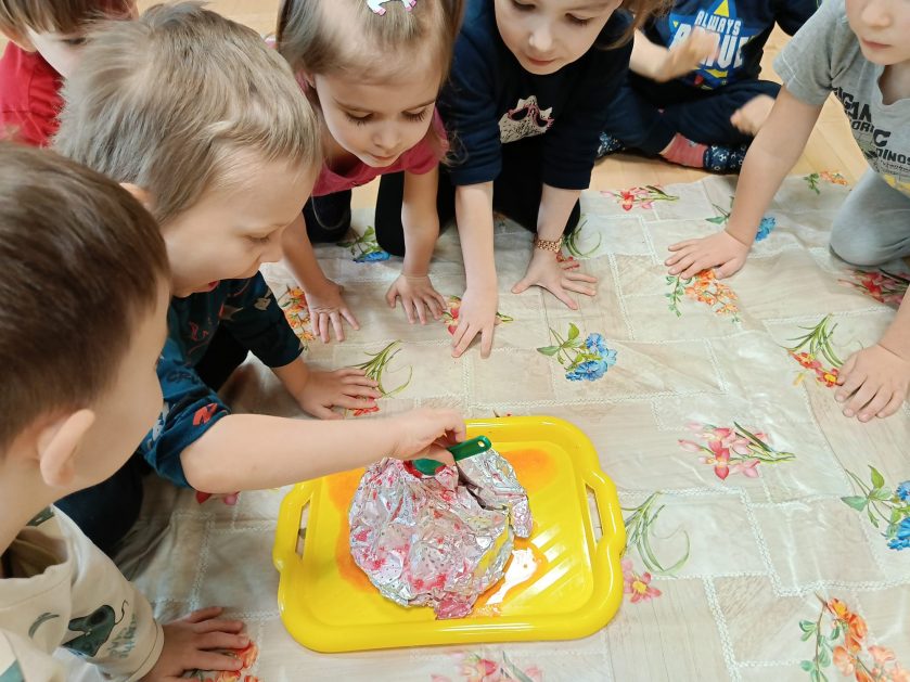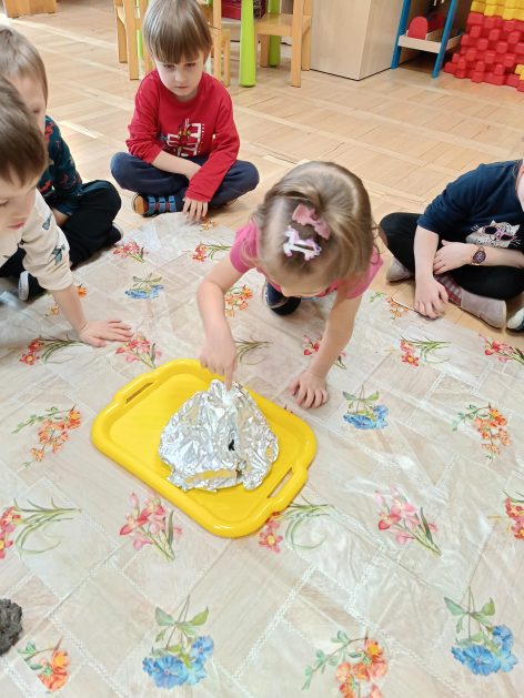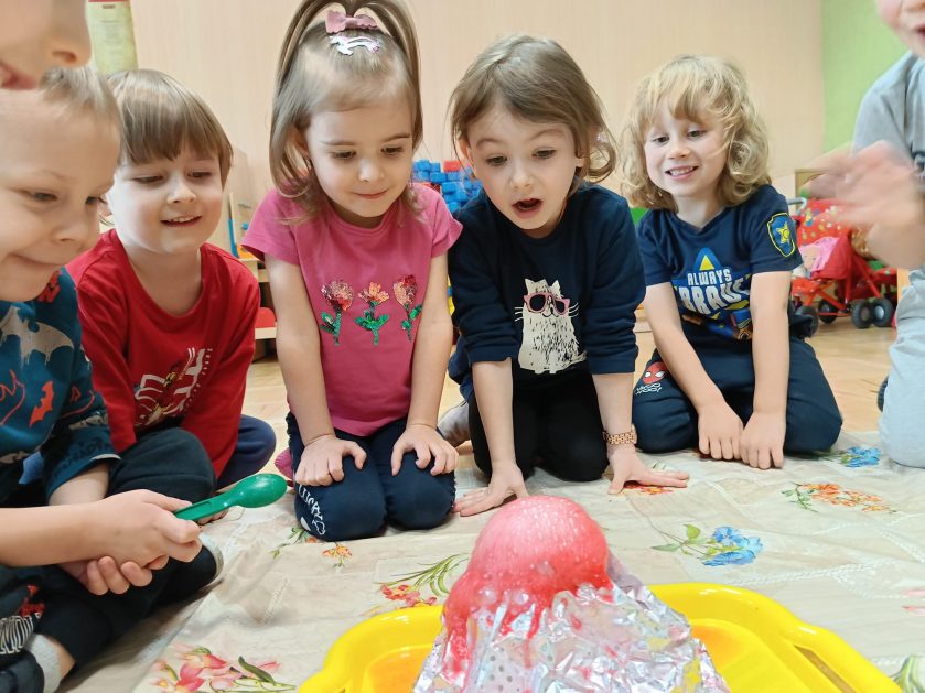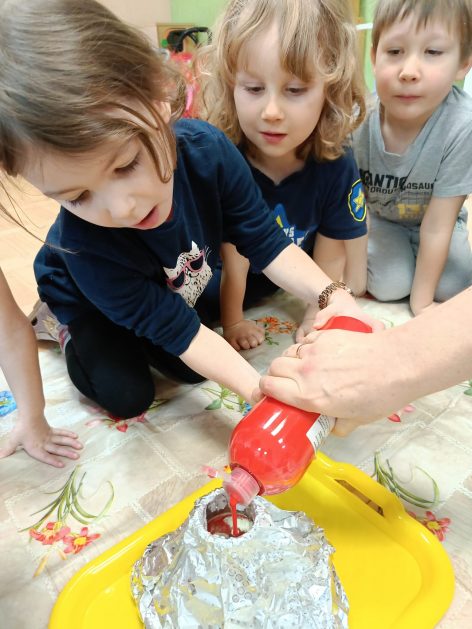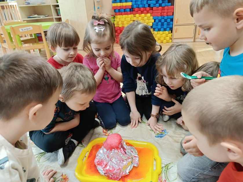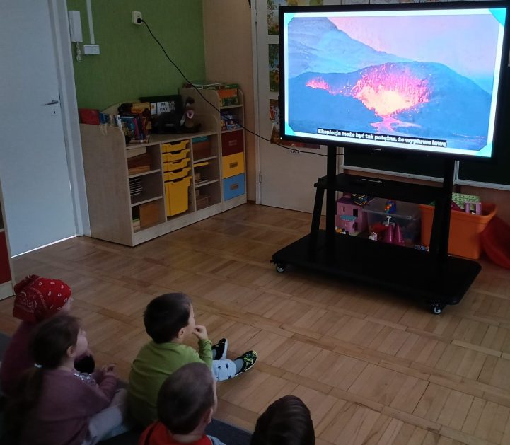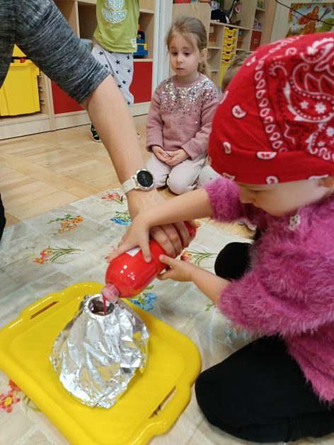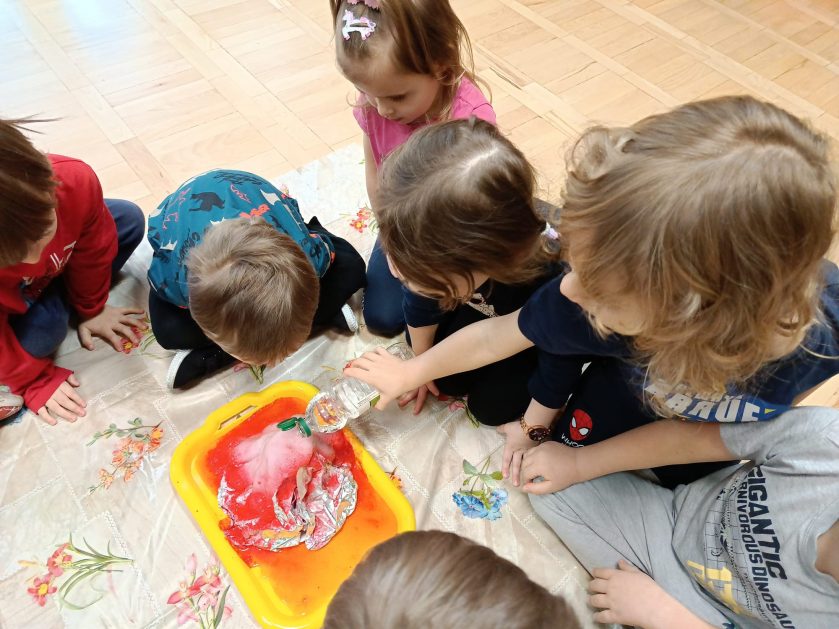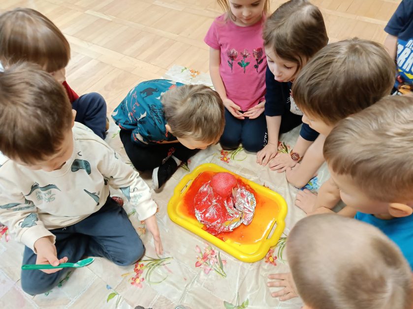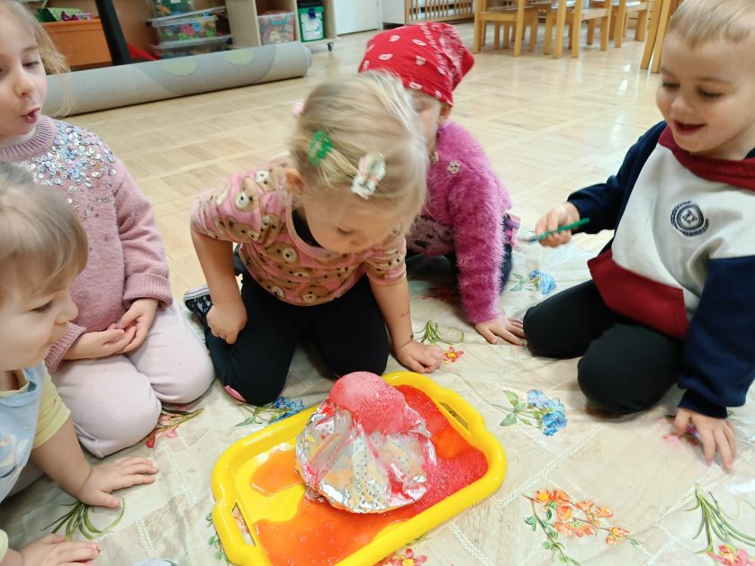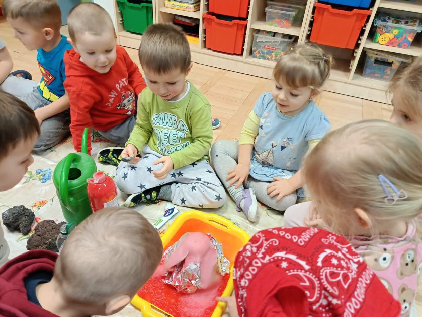 W dniu 23 stycznia 2024 r. maluszki i czterolatki rozmawiały o tym, co znajduję się pod ziemią. Podczas zajęć dzieci dowiedziały się co to są wulkany, jak powstają i dlaczego wybuchają. Oglądając film edukacyjny przedszkolaki dowiedziały się ciekawych informacji na temat wulkanów, miejsc i przyczyn ich powstawania, kiedy wybuchają i co się z nich wydobywa. W trakcie zabawy „Lejąca lawa” dzieci ćwiczyły koordynację wzrokowo- ruchową. Trzylatki jako obserwatorzy eksperymentu mogły zaobserwować symulację wybuchu wulkanu. Dzieci były pod ogromnym wrażeniem eksperymentu.