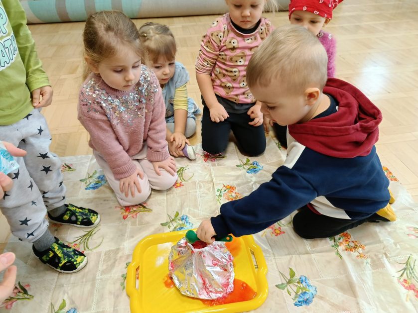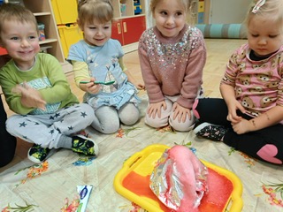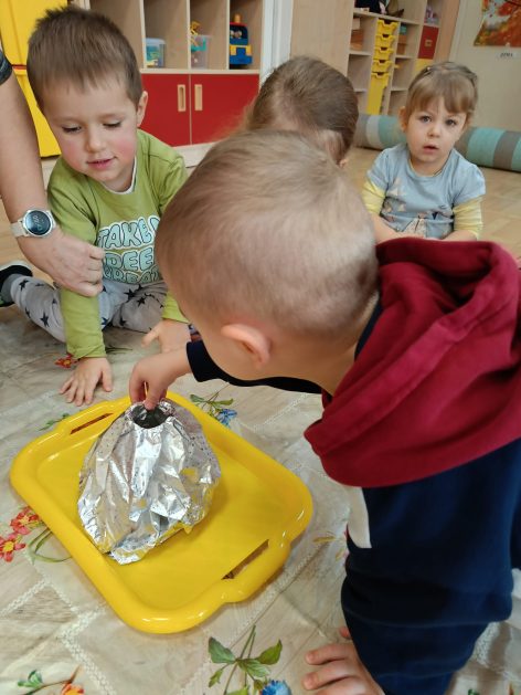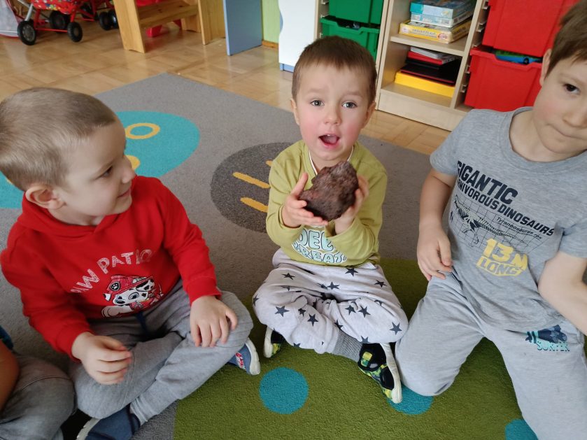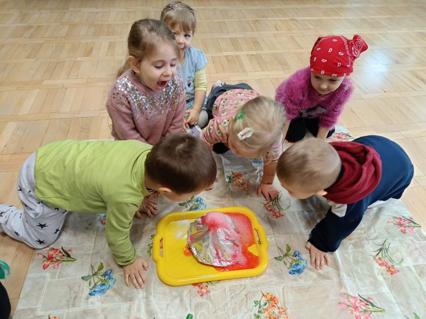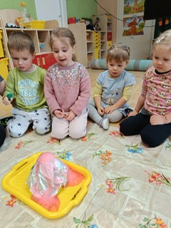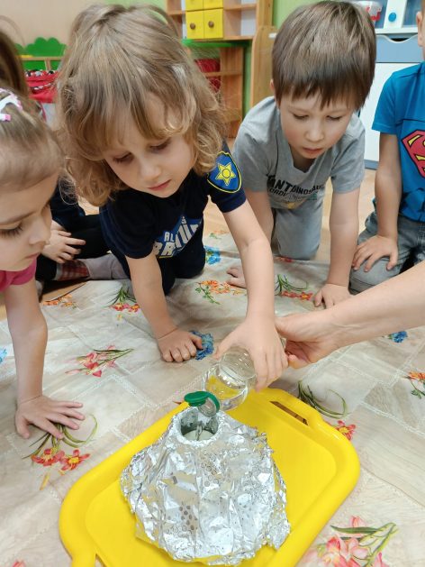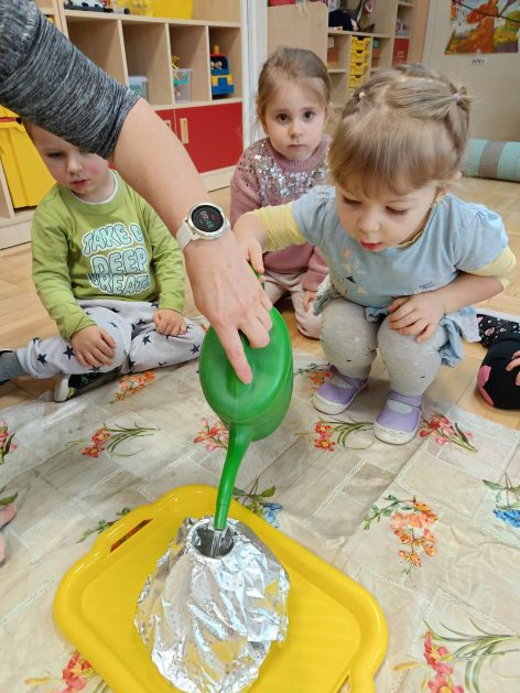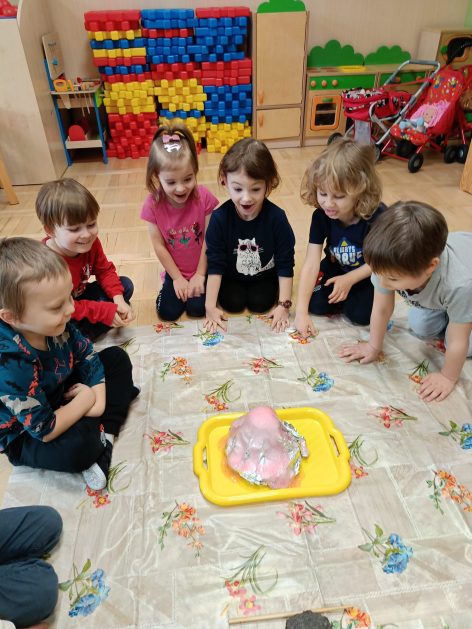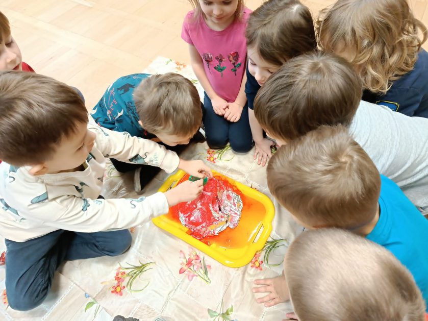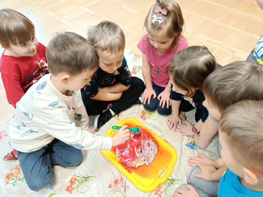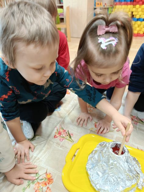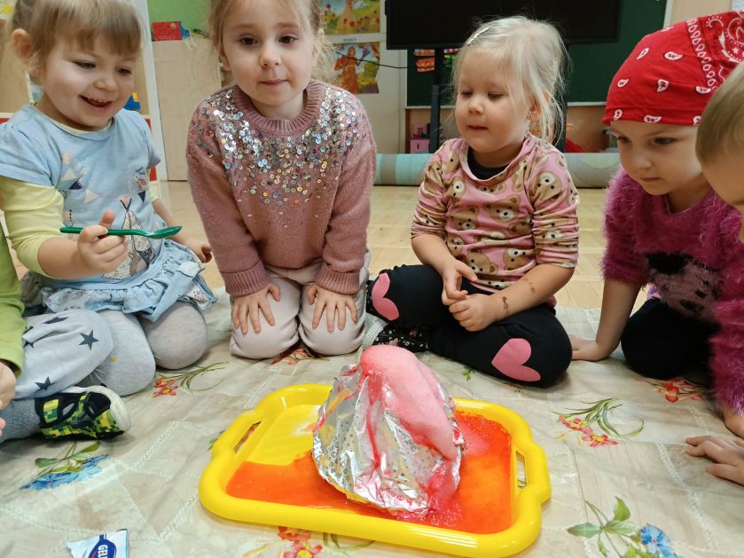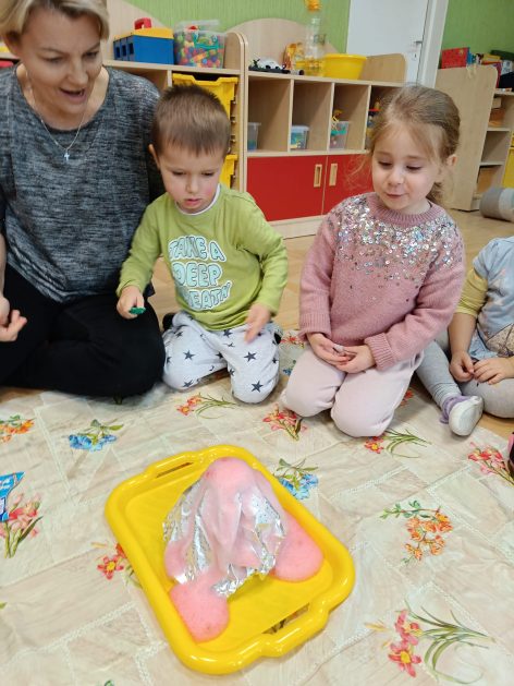 W dniu 23 stycznia 2024 r. maluszki i czterolatki rozmawiały o tym, co znajduję się pod ziemią. Podczas zajęć dzieci dowiedziały się co to są wulkany, jak powstają i dlaczego wybuchają. Oglądając film edukacyjny przedszkolaki dowiedziały się ciekawych informacji na temat wulkanów, miejsc i przyczyn ich powstawania, kiedy wybuchają i co się z nich wydobywa. W trakcie zabawy „Lejąca lawa” dzieci ćwiczyły koordynację wzrokowo- ruchową. Trzylatki jako obserwatorzy eksperymentu mogły zaobserwować symulację wybuchu wulkanu. Dzieci były pod ogromnym wrażeniem eksperymentu.