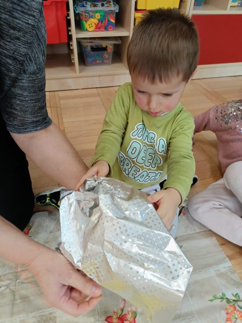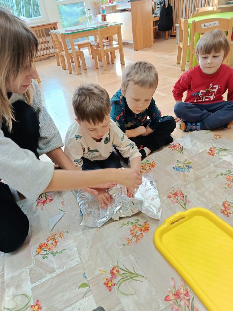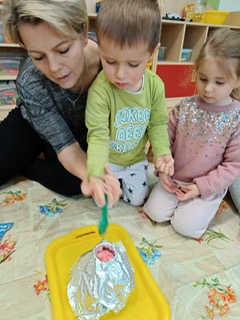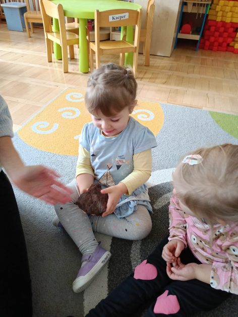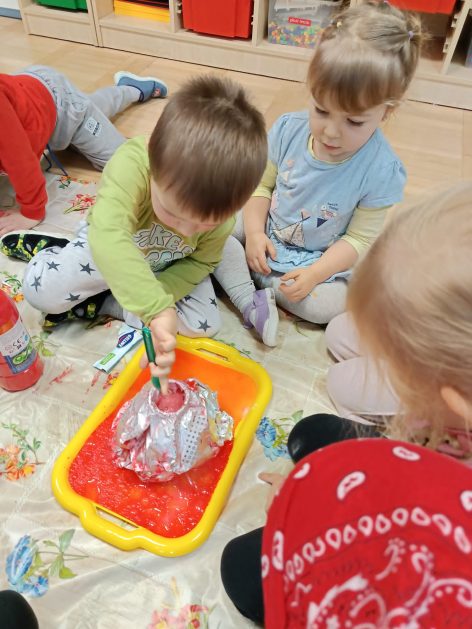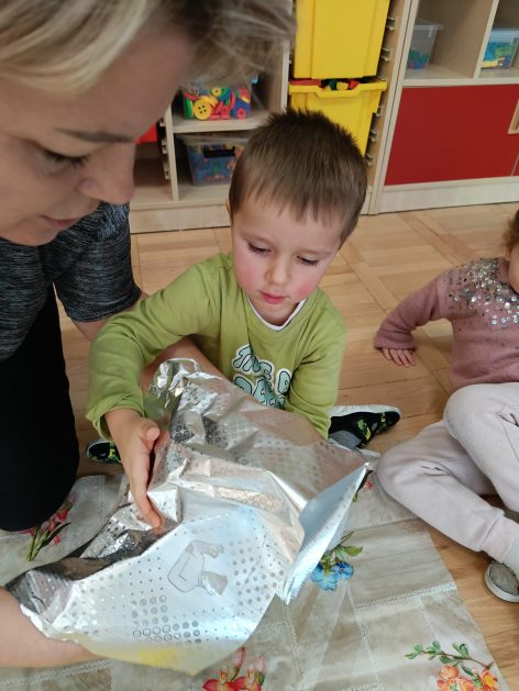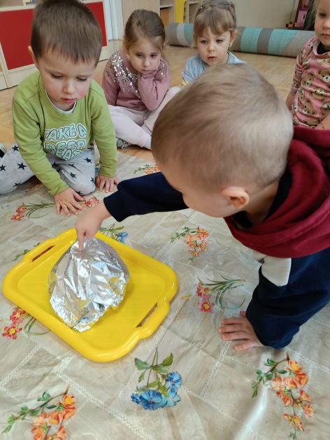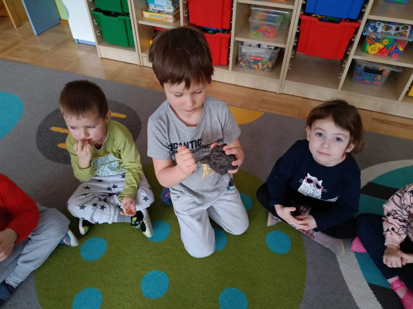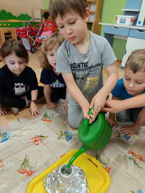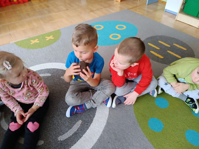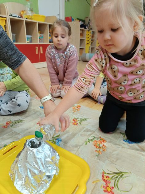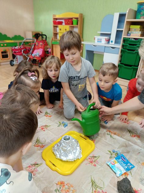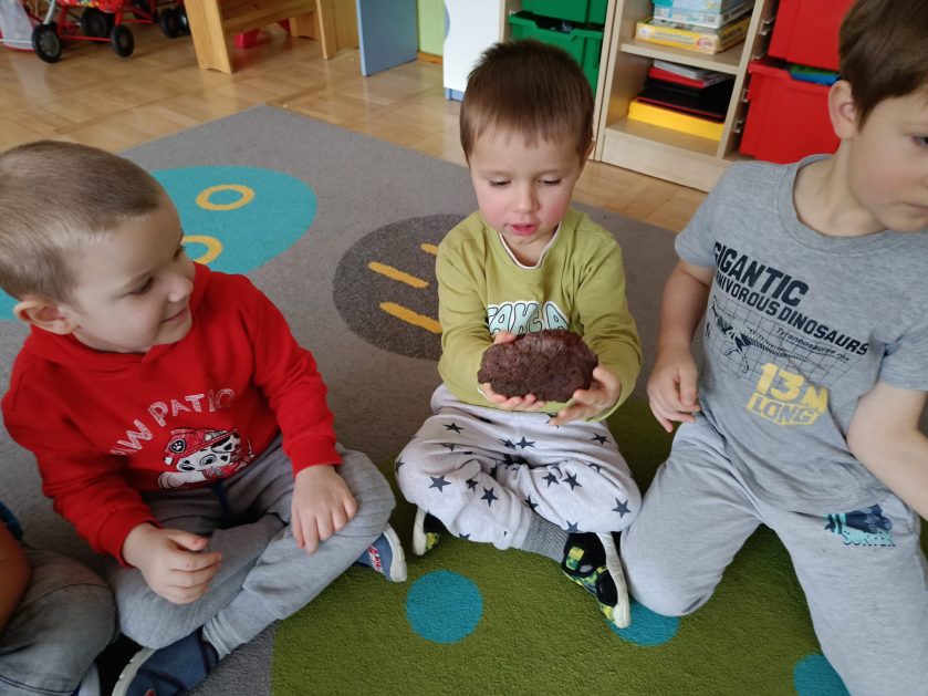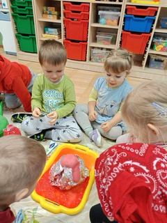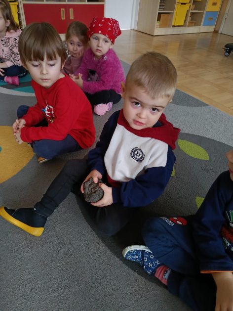 W dniu 23 stycznia 2024 r. maluszki i czterolatki rozmawiały o tym, co znajduję się pod ziemią. Podczas zajęć dzieci dowiedziały się co to są wulkany, jak powstają i dlaczego wybuchają. Oglądając film edukacyjny przedszkolaki dowiedziały się ciekawych informacji na temat wulkanów, miejsc i przyczyn ich powstawania, kiedy wybuchają i co się z nich wydobywa. W trakcie zabawy „Lejąca lawa” dzieci ćwiczyły koordynację wzrokowo- ruchową. Trzylatki jako obserwatorzy eksperymentu mogły zaobserwować symulację wybuchu wulkanu. Dzieci były pod ogromnym wrażeniem eksperymentu.