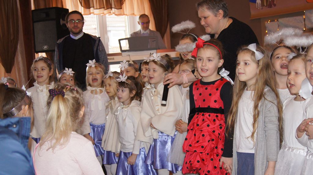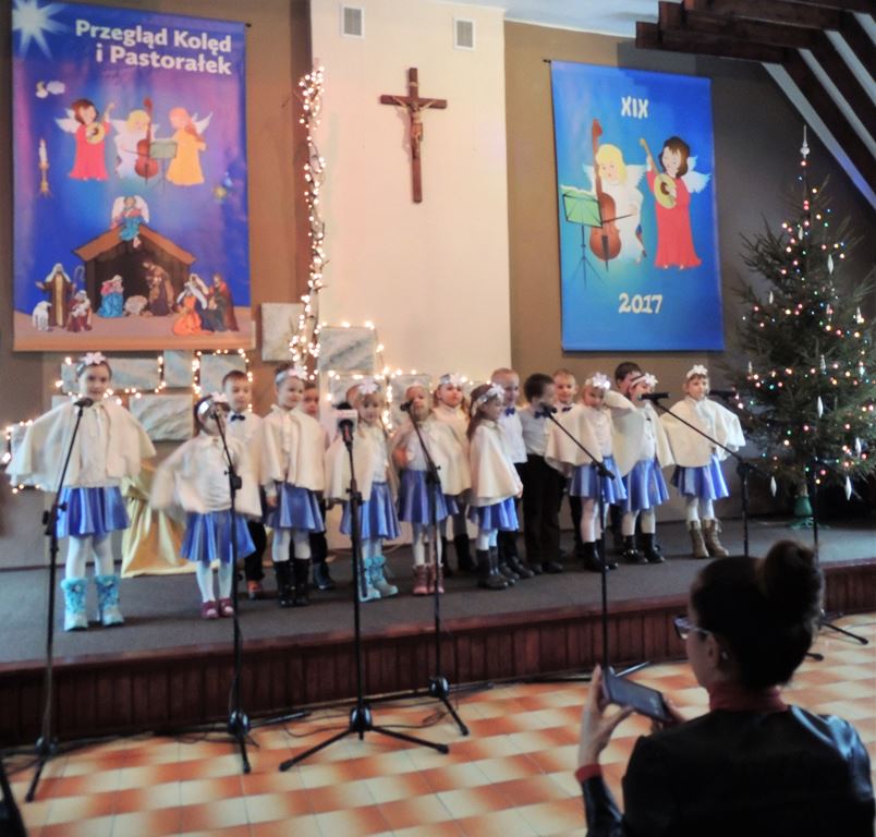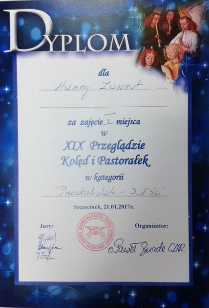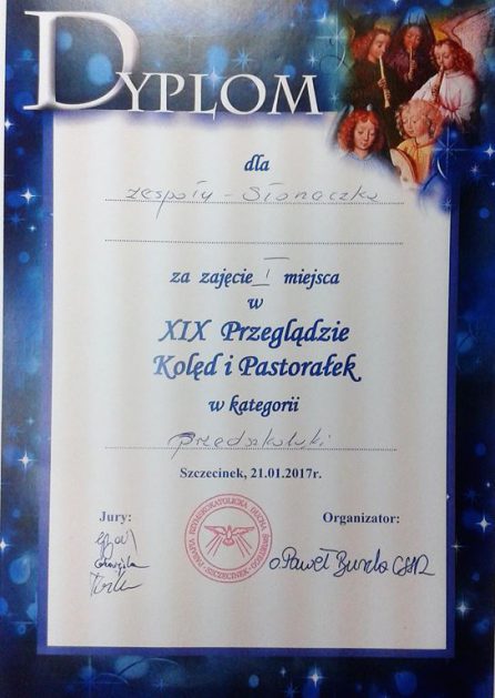 Naszym przedszkolakom tak bardzo spodobało się kolędowanie, że postanowiły wziąć udział w XIX Przeglądzie Kolęd i Pastorałek organizowanym przez Parafię Ducha Świętego w Szczecinku. Zespół „Słoneczka” składający się z 5-latków z grupy p. Kasi zdobył zaszczytne pierwsze miejsce. Hania Zawrot z grupy p. Uli również zajęła I miejsce w kategorii soliści. Gratulujemy!