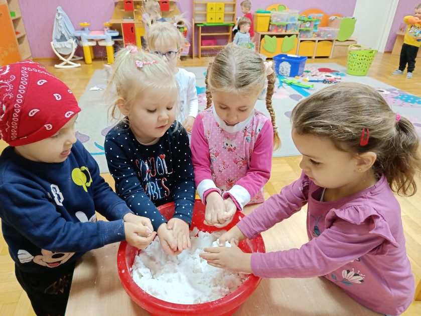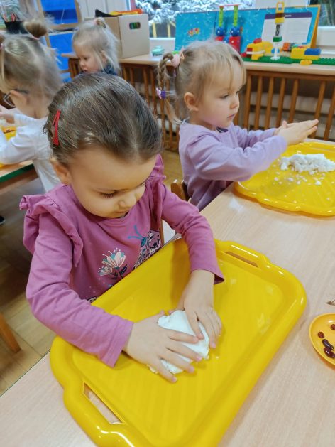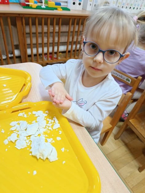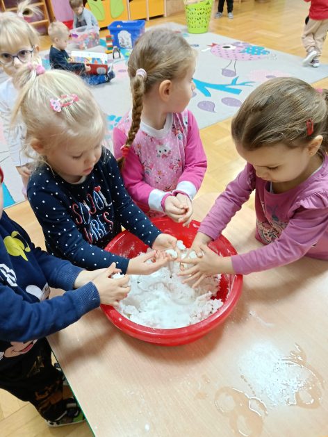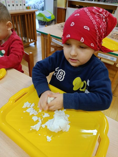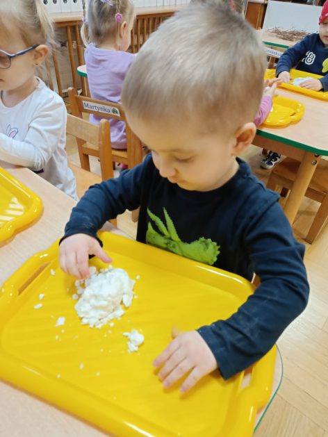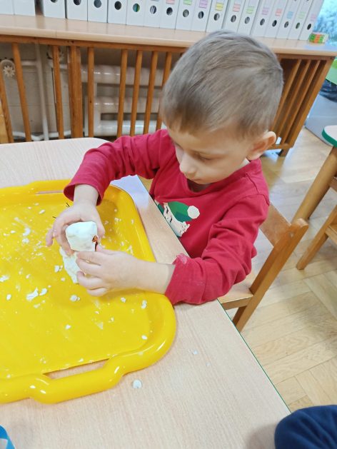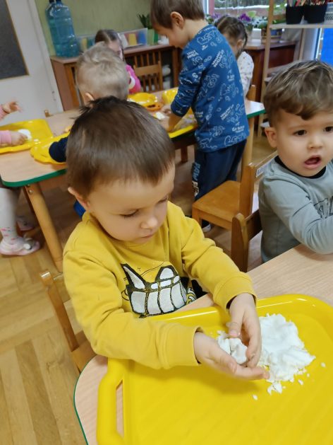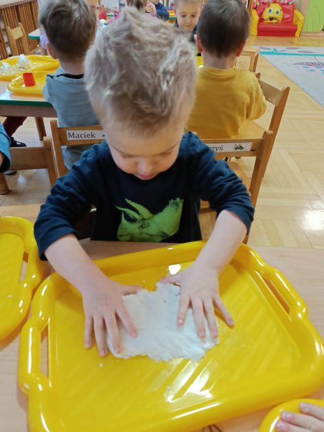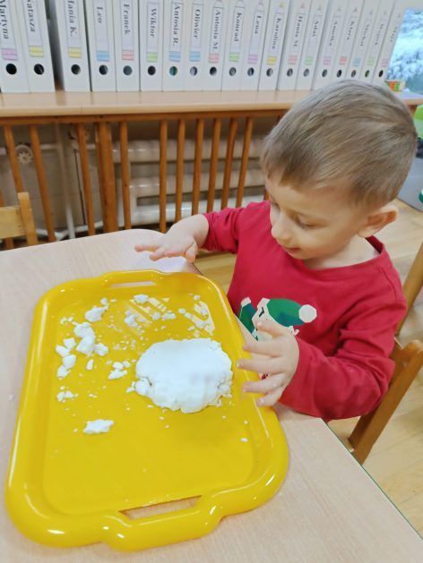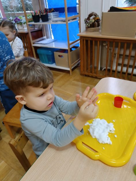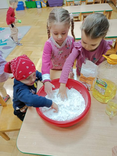 11 stycznia – nowy dzień, nowe wyzwania… dzisiaj dzień zabaw sensorycznych w grupie 3-latkow. Tym razem samodzielnie tworzyliśmy sztuczny śnieg z mąki ziemniaczanej i oleju. Zabawa przyniosła dzieciom wiele radości. Już wiedzą, że gdy zima spłata nam figla i nie okryje świata białym puchem, zawsze możemy zrobić go sami.