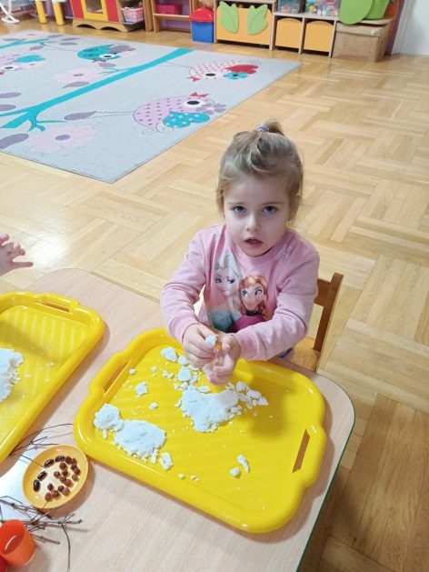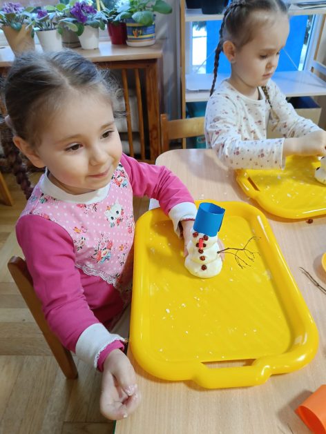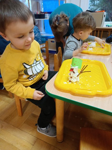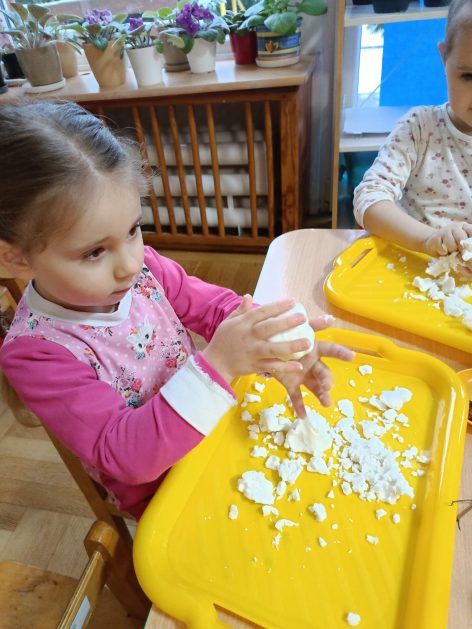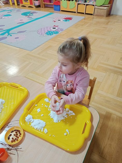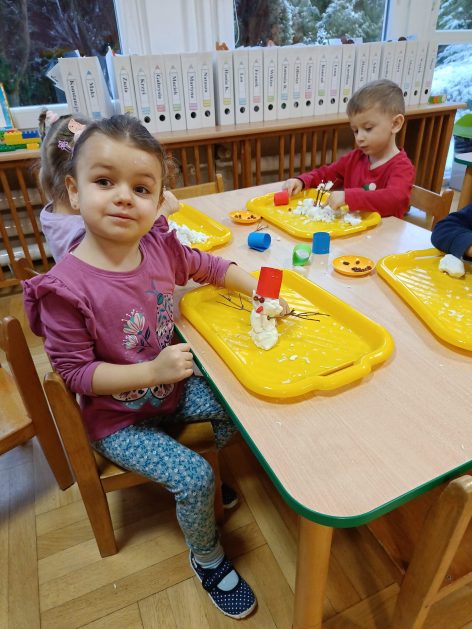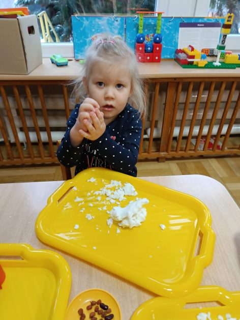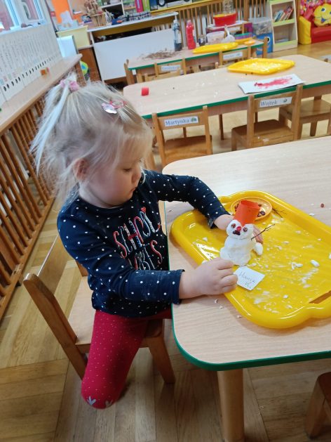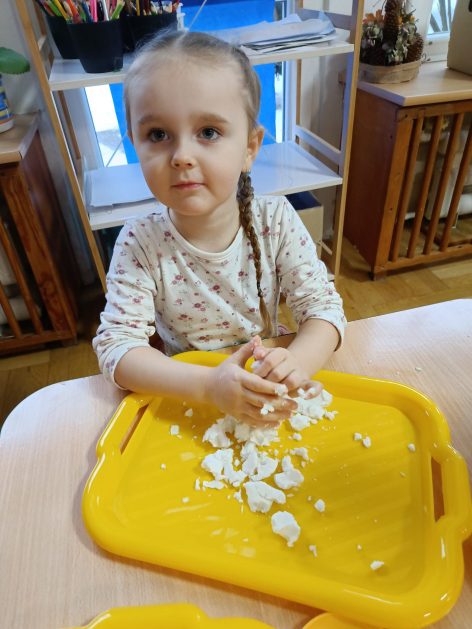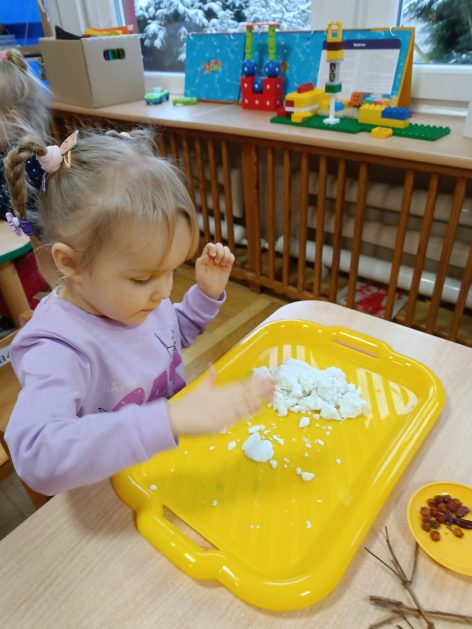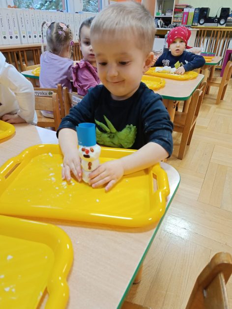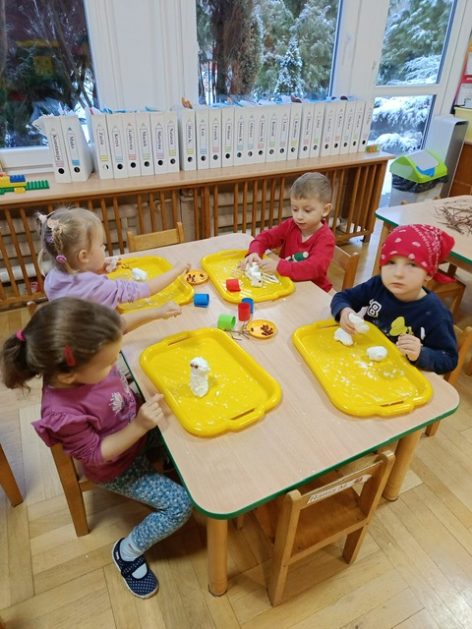 11 stycznia – nowy dzień, nowe wyzwania… dzisiaj dzień zabaw sensorycznych w grupie 3-latkow. Tym razem samodzielnie tworzyliśmy sztuczny śnieg z mąki ziemniaczanej i oleju. Zabawa przyniosła dzieciom wiele radości. Już wiedzą, że gdy zima spłata nam figla i nie okryje świata białym puchem, zawsze możemy zrobić go sami.